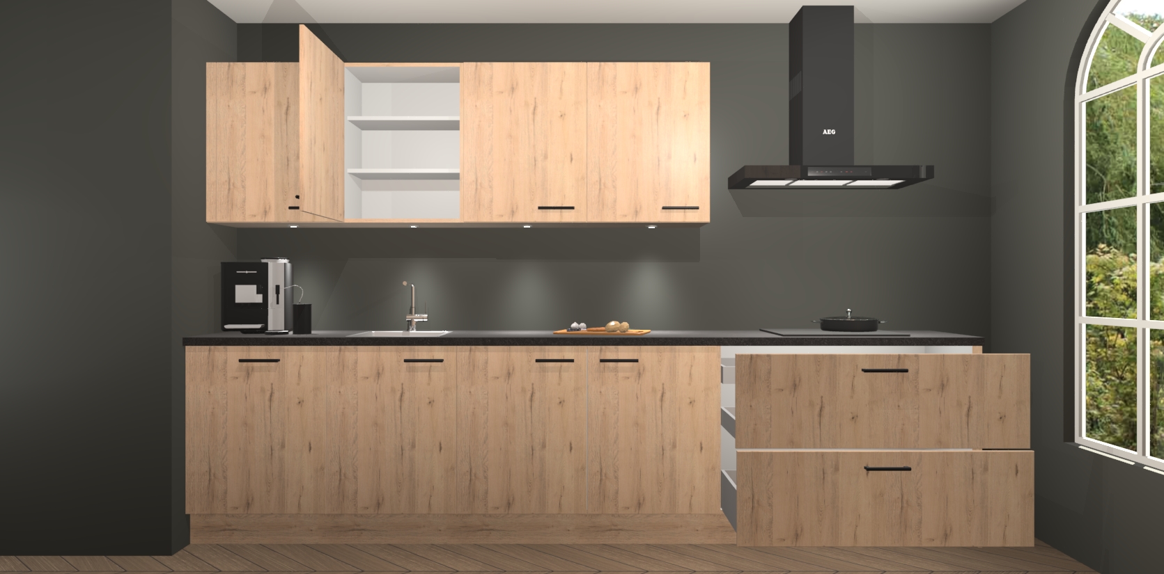 De softclose deuren openen en sluiten is ook heel eenvoudig - geniet van een moeiteloze keukenervaring, zelfs als er kinderen rondlopen. Voor extra gemak bij het plaatsen van uw bestelling bieden we ook een upgrade naar een kookplaat met geïntegreerde afzuiging.