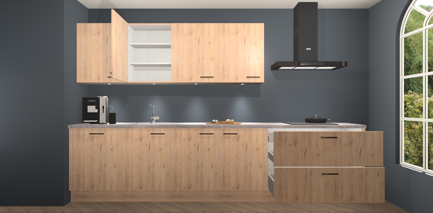 De softclose deuren openen en sluiten is ook heel eenvoudig - geniet van een moeiteloze keukenervaring, zelfs als er kinderen rondlopen. Voor extra gemak bij het plaatsen van uw bestelling bieden we ook een upgrade naar een kookplaat met geïntegreerde afzuiging.