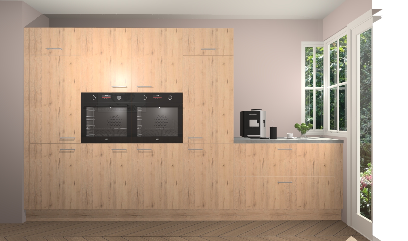Een stijlvolle en praktische keuken als deze mag gezien worden. Dankzij de prachtige madera natuur matte afwerking wordt de keuken gemakkelijk het middelpunt van uw huis - hij ziet er geweldig uit onder allerlei lichtomstandigheden, van dag tot nacht!