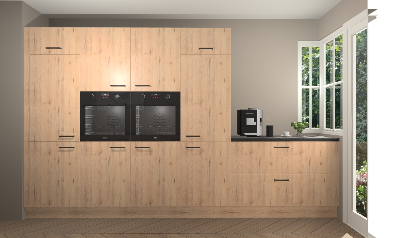 Een stijlvolle en praktische keuken als deze mag gezien worden. Dankzij de prachtige madera natuur matte afwerking wordt de keuken gemakkelijk het middelpunt van uw huis - hij ziet er geweldig uit onder allerlei lichtomstandigheden, van dag tot nacht!