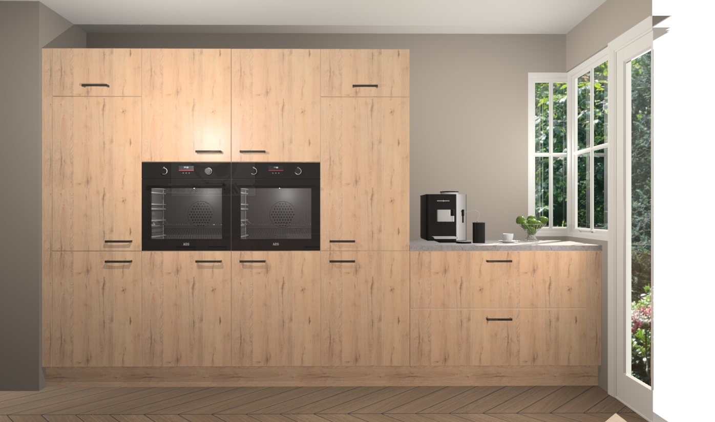 Een stijlvolle en praktische keuken als deze mag gezien worden. Dankzij de prachtige madera natuur matte afwerking wordt de keuken gemakkelijk het middelpunt van uw huis - hij ziet er geweldig uit onder allerlei lichtomstandigheden, van dag tot nacht!