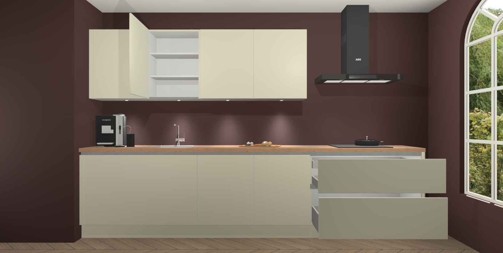De softclose deuren openen en sluiten is ook heel eenvoudig - geniet van een moeiteloze keukenervaring, zelfs als er kinderen rondlopen. Voor extra gemak bij het plaatsen van uw bestelling bieden we ook een upgrade naar een kookplaat met geïntegreerde afzuiging.