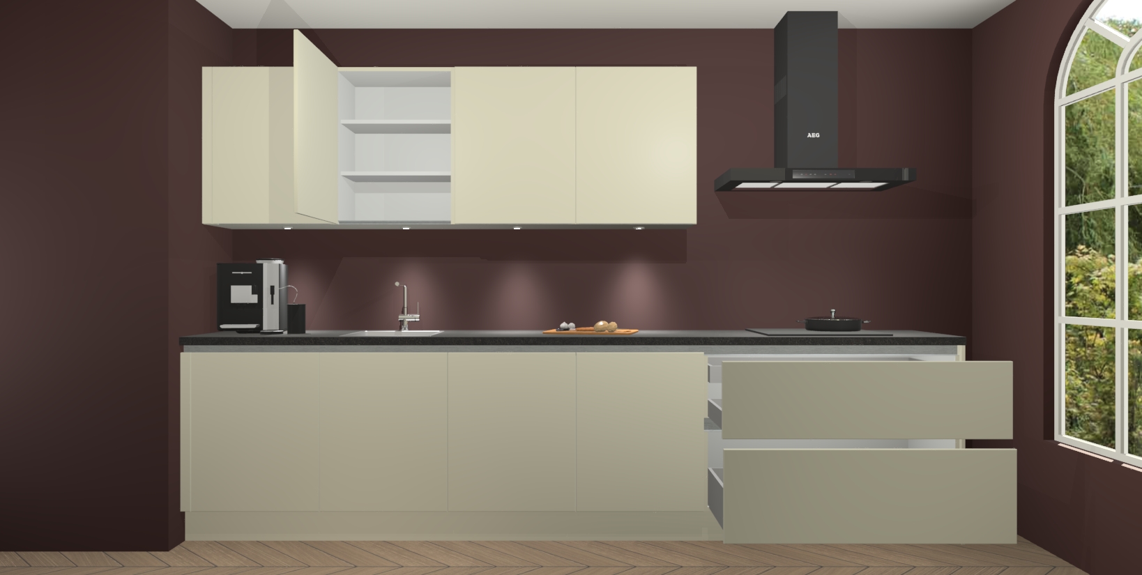 De softclose deuren openen en sluiten is ook heel eenvoudig - geniet van een moeiteloze keukenervaring, zelfs als er kinderen rondlopen. Voor extra gemak bij het plaatsen van uw bestelling bieden we ook een upgrade naar een kookplaat met geïntegreerde afzuiging.