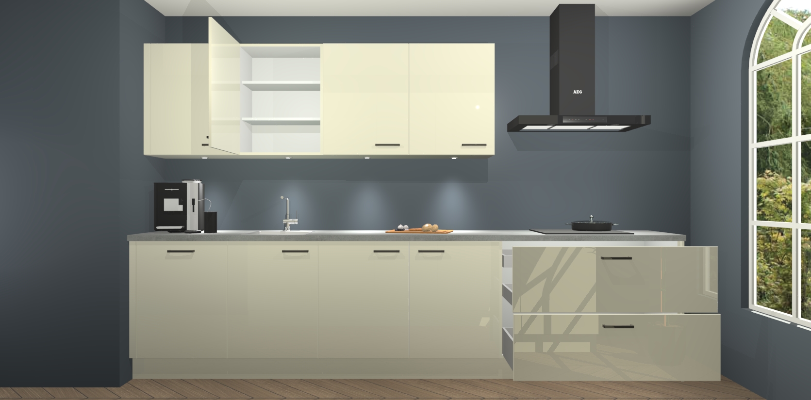 De softclose deuren openen en sluiten is ook heel eenvoudig - geniet van een moeiteloze keukenervaring, zelfs als er kinderen rondlopen. Voor extra gemak bij het plaatsen van uw bestelling bieden we ook een upgrade naar een kookplaat met geïntegreerde afzuiging.