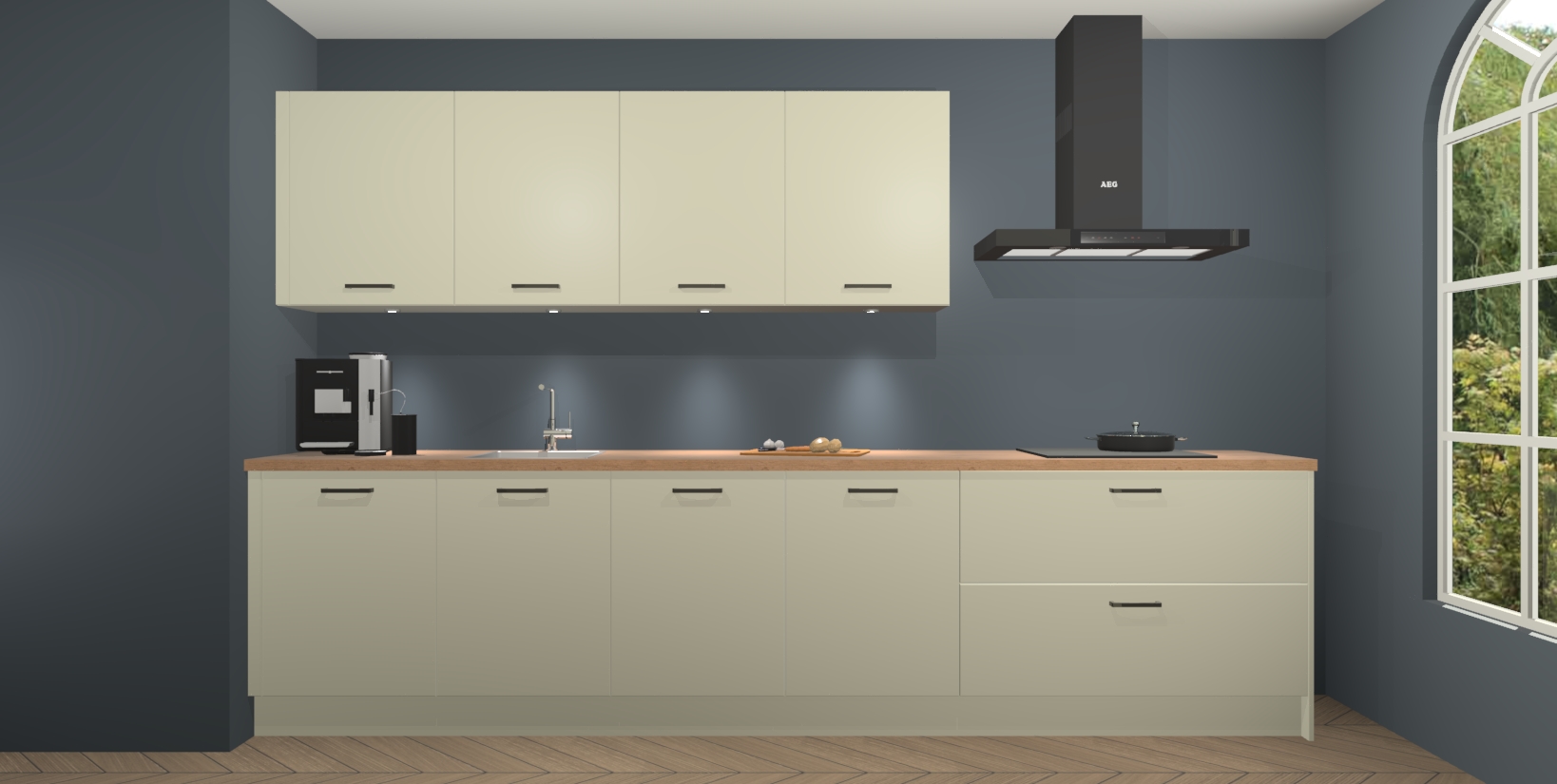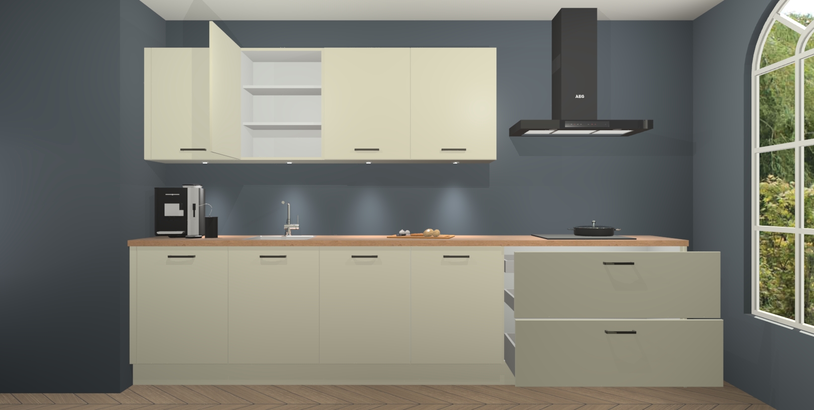 De softclose deuren openen en sluiten is ook heel eenvoudig - geniet van een moeiteloze keukenervaring, zelfs als er kinderen rondlopen. Voor extra gemak bij het plaatsen van uw bestelling bieden we ook een upgrade naar een kookplaat met geïntegreerde afzuiging.