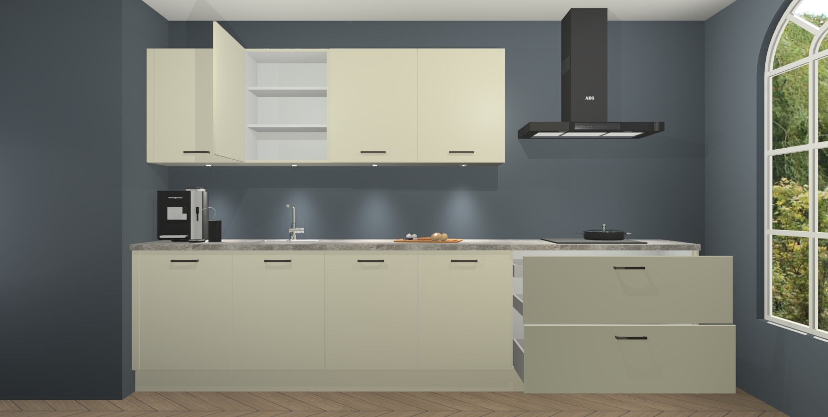 De softclose deuren openen en sluiten is ook heel eenvoudig - geniet van een moeiteloze keukenervaring, zelfs als er kinderen rondlopen. Voor extra gemak bij het plaatsen van uw bestelling bieden we ook een upgrade naar een kookplaat met geïntegreerde afzuiging.