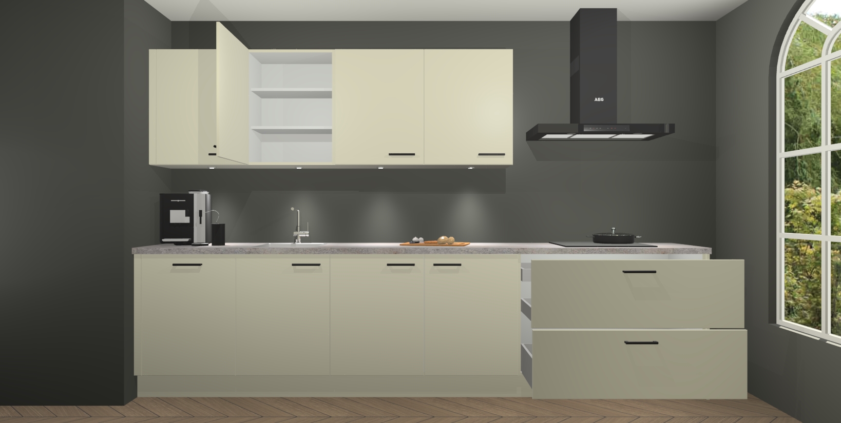 De softclose deuren openen en sluiten is ook heel eenvoudig - geniet van een moeiteloze keukenervaring, zelfs als er kinderen rondlopen. Voor extra gemak bij het plaatsen van uw bestelling bieden we ook een upgrade naar een kookplaat met geïntegreerde afzuiging.