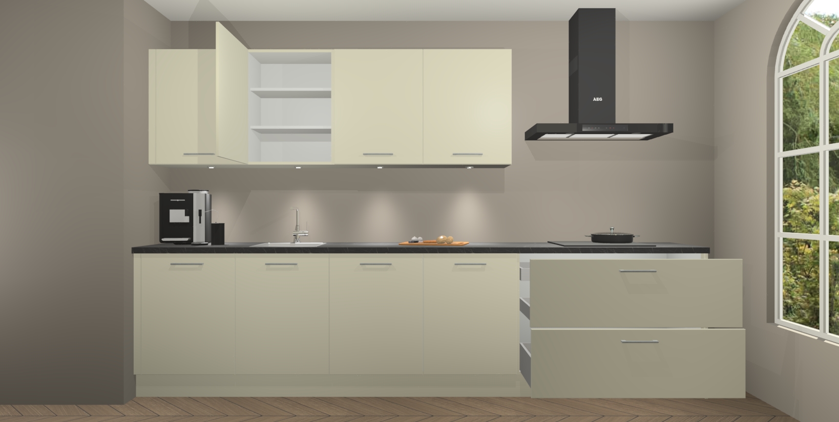 De softclose deuren openen en sluiten is ook heel eenvoudig - geniet van een moeiteloze keukenervaring, zelfs als er kinderen rondlopen. Voor extra gemak bij het plaatsen van uw bestelling bieden we ook een upgrade naar een kookplaat met geïntegreerde afzuiging.