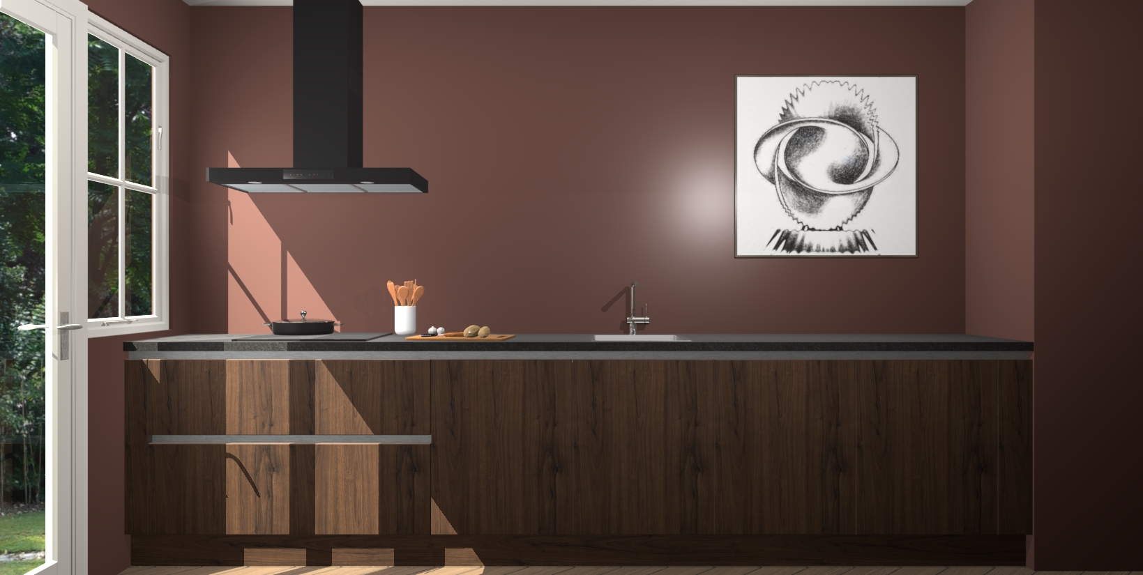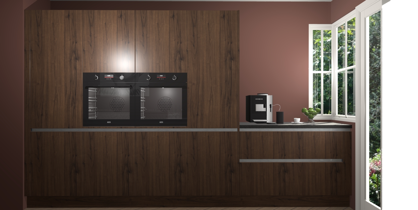 Een stijlvolle en praktische keuken als deze mag gezien worden. Dankzij de prachtige noten matte afwerking wordt de keuken gemakkelijk het middelpunt van uw huis - hij ziet er geweldig uit onder allerlei lichtomstandigheden, van dag tot nacht!