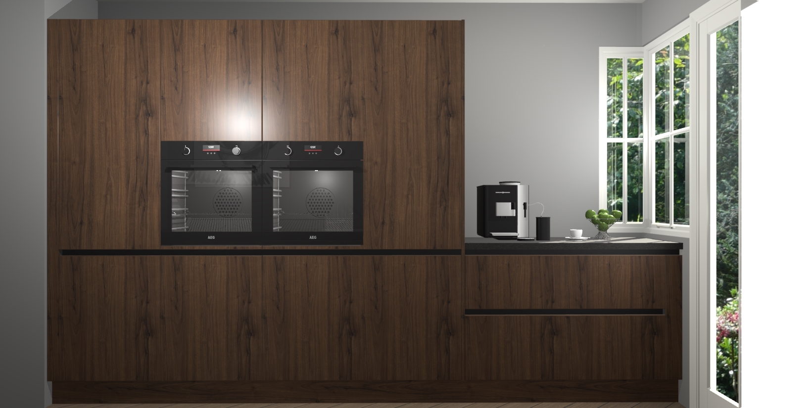 Een stijlvolle en praktische keuken als deze mag gezien worden. Dankzij de prachtige noten matte afwerking wordt de keuken gemakkelijk het middelpunt van uw huis - hij ziet er geweldig uit onder allerlei lichtomstandigheden, van dag tot nacht!