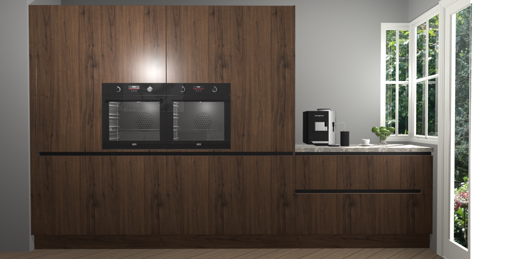 Een stijlvolle en praktische keuken als deze mag gezien worden. Dankzij de prachtige noten matte afwerking wordt de keuken gemakkelijk het middelpunt van uw huis - hij ziet er geweldig uit onder allerlei lichtomstandigheden, van dag tot nacht!