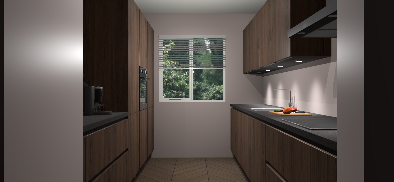 Een stijlvolle en praktische keuken als deze mag gezien worden. Dankzij de prachtige Noten matte afwerking wordt de keuken gemakkelijk het middelpunt van uw huis - hij ziet er geweldig uit onder allerlei lichtomstandigheden, van dag tot nacht!