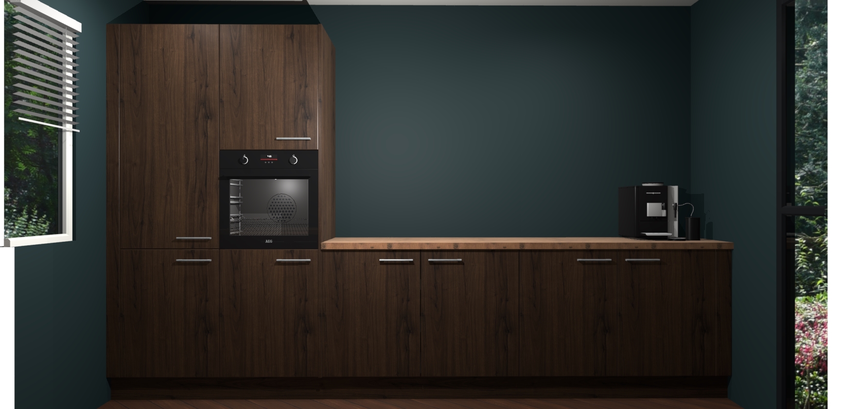 Welkom bij de Noten keuken Lusaka. Deze prachtige keuken zal de komende jaren het middelpunt van de belangstelling in uw huis zijn. Uitgerust met vijf inbouwapparaten komt u nooit kookgereedschap tekort. Bovendien geeft de warme houtlook elke ruimte een uitnodigende en tijdloze uitstraling.