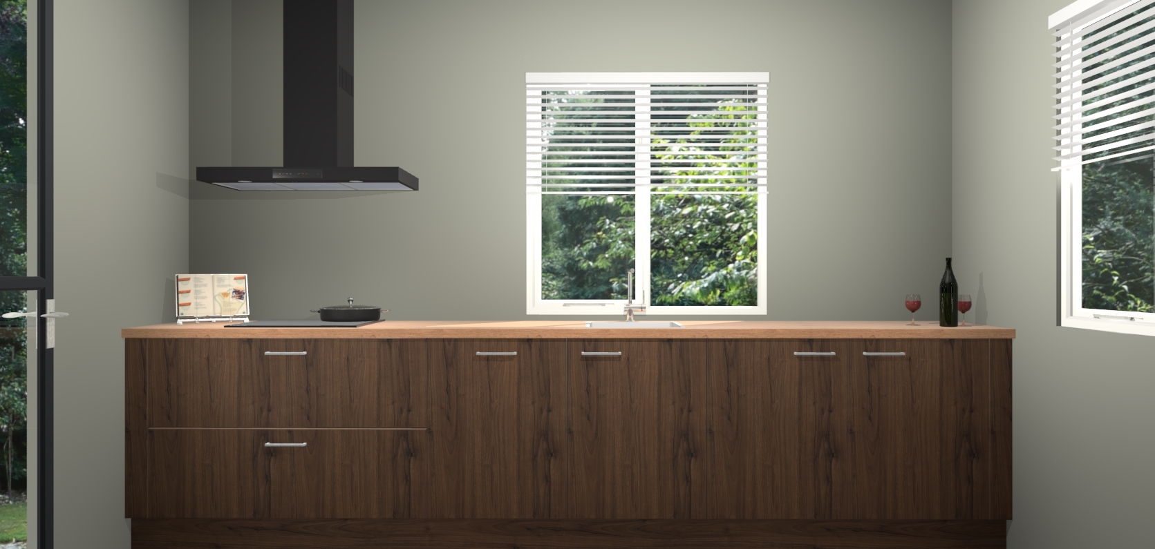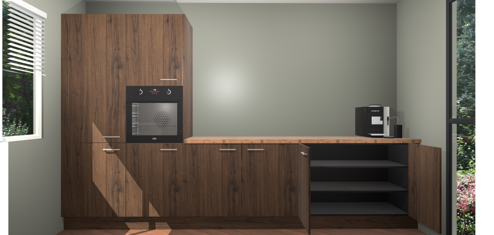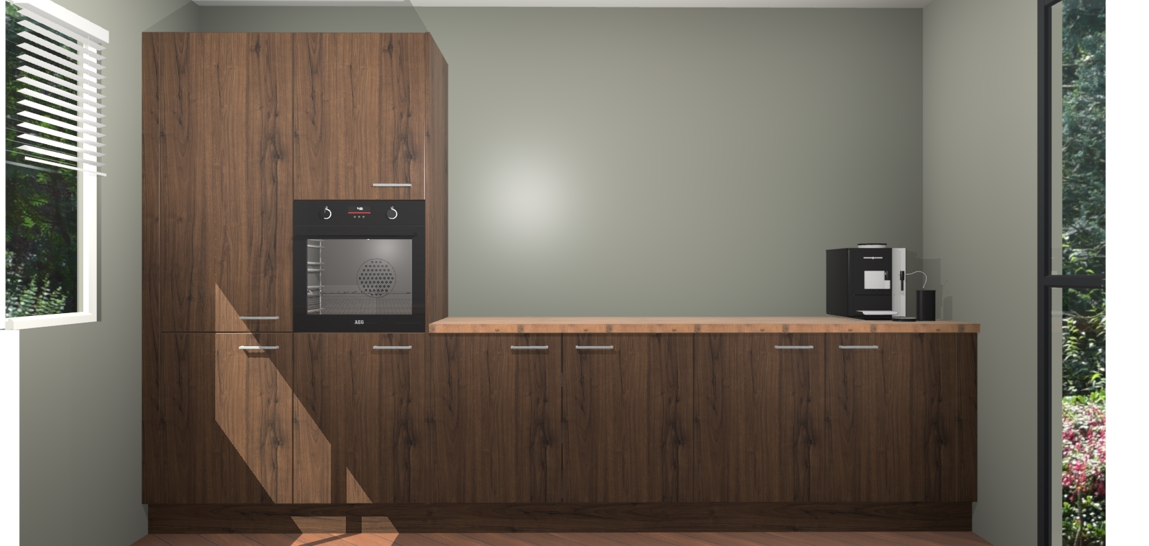 Welkom bij de Noten keuken Lusaka. Deze prachtige keuken zal de komende jaren het middelpunt van de belangstelling in uw huis zijn. Uitgerust met vijf inbouwapparaten komt u nooit kookgereedschap tekort. Bovendien geeft de warme houtlook elke ruimte een uitnodigende en tijdloze uitstraling.
