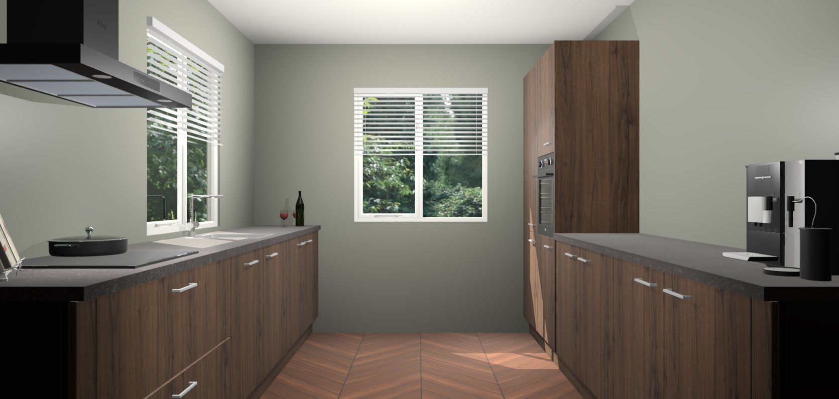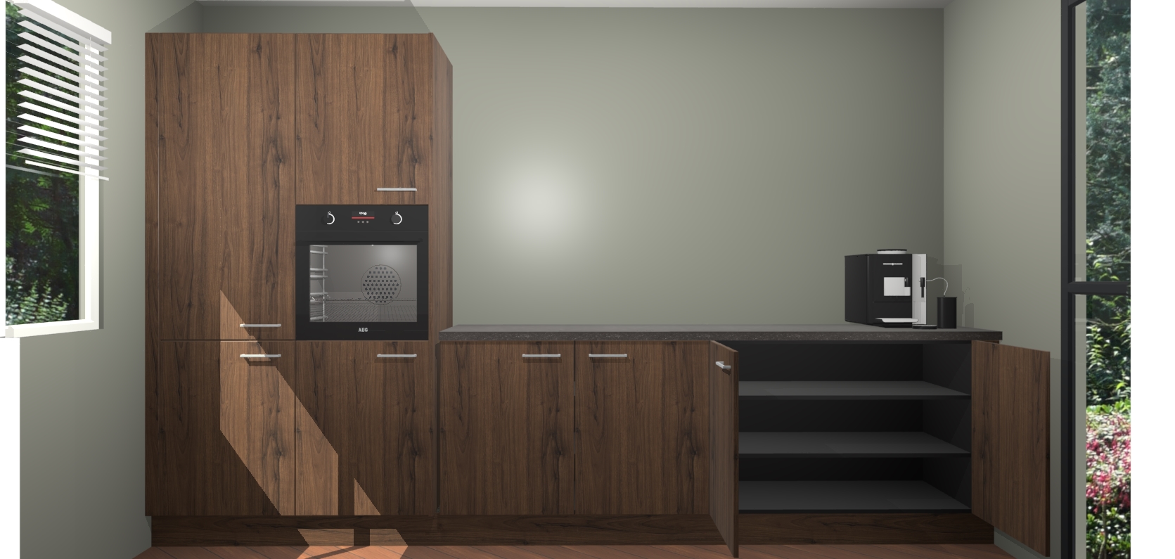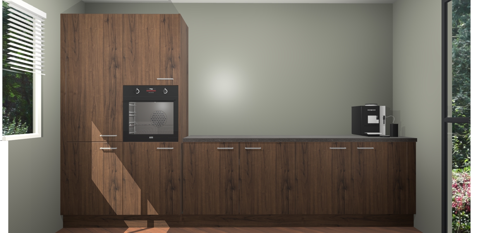 Welkom bij de Noten keuken Lusaka. Deze prachtige keuken zal de komende jaren het middelpunt van de belangstelling in uw huis zijn. Uitgerust met vijf inbouwapparaten komt u nooit kookgereedschap tekort. Bovendien geeft de warme houtlook elke ruimte een uitnodigende en tijdloze uitstraling.