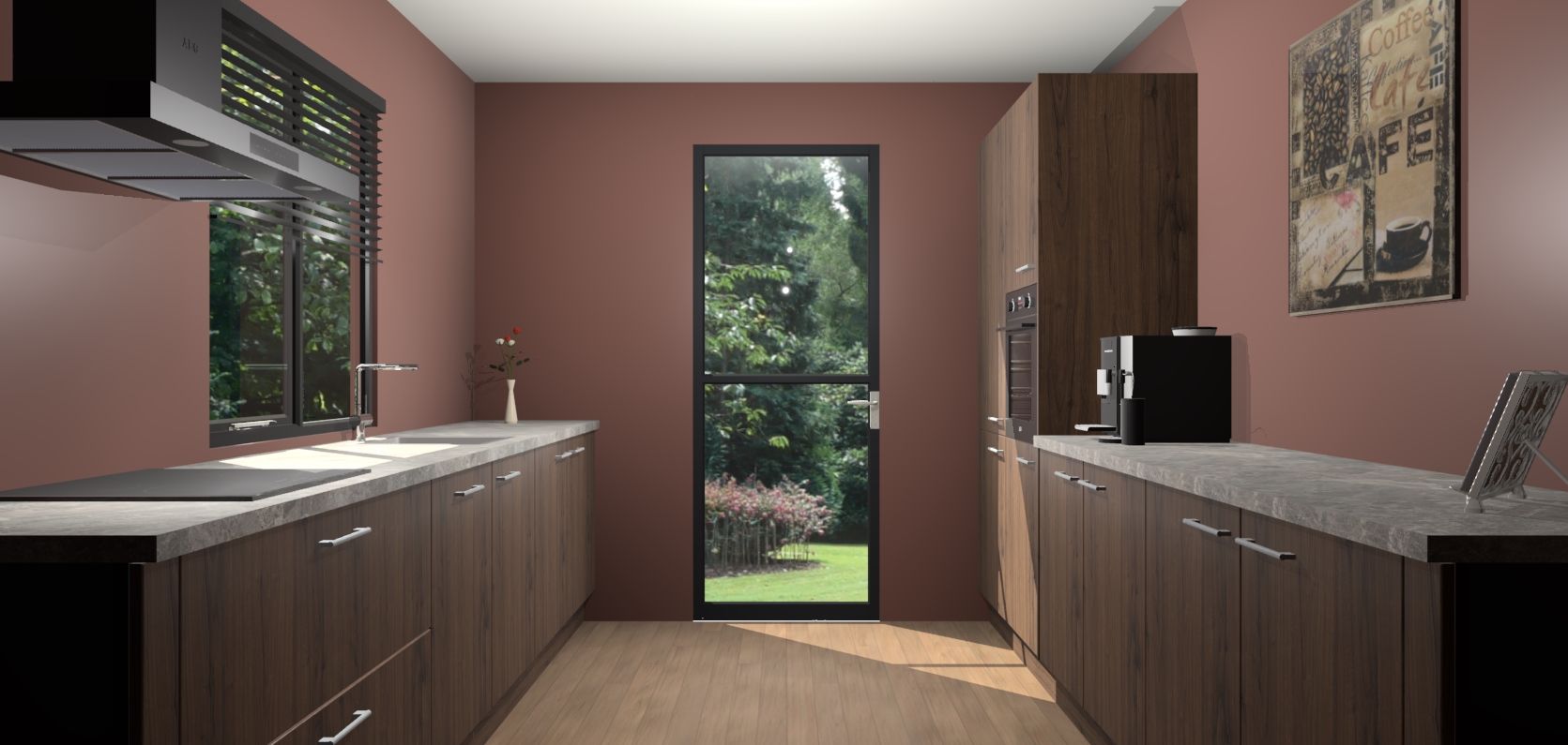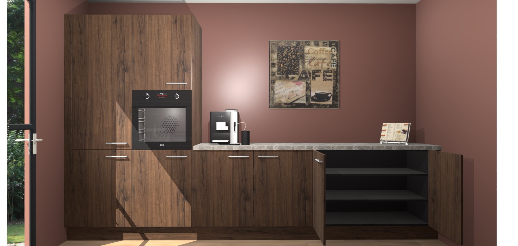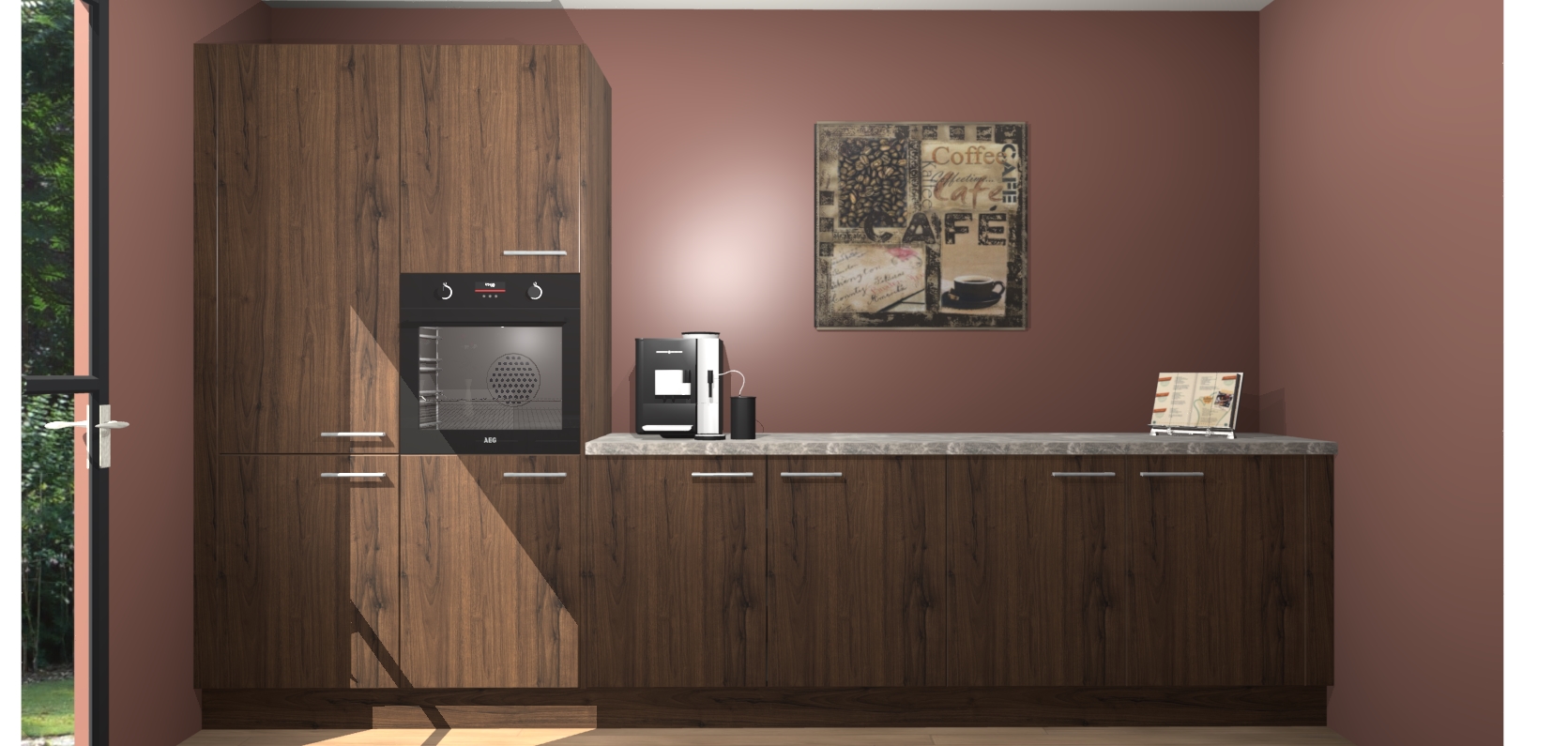 Welkom bij de Noten keuken Lusaka. Deze prachtige keuken zal de komende jaren het middelpunt van de belangstelling in uw huis zijn. Uitgerust met vijf inbouwapparaten komt u nooit kookgereedschap tekort. Bovendien geeft de warme houtlook elke ruimte een uitnodigende en tijdloze uitstraling.