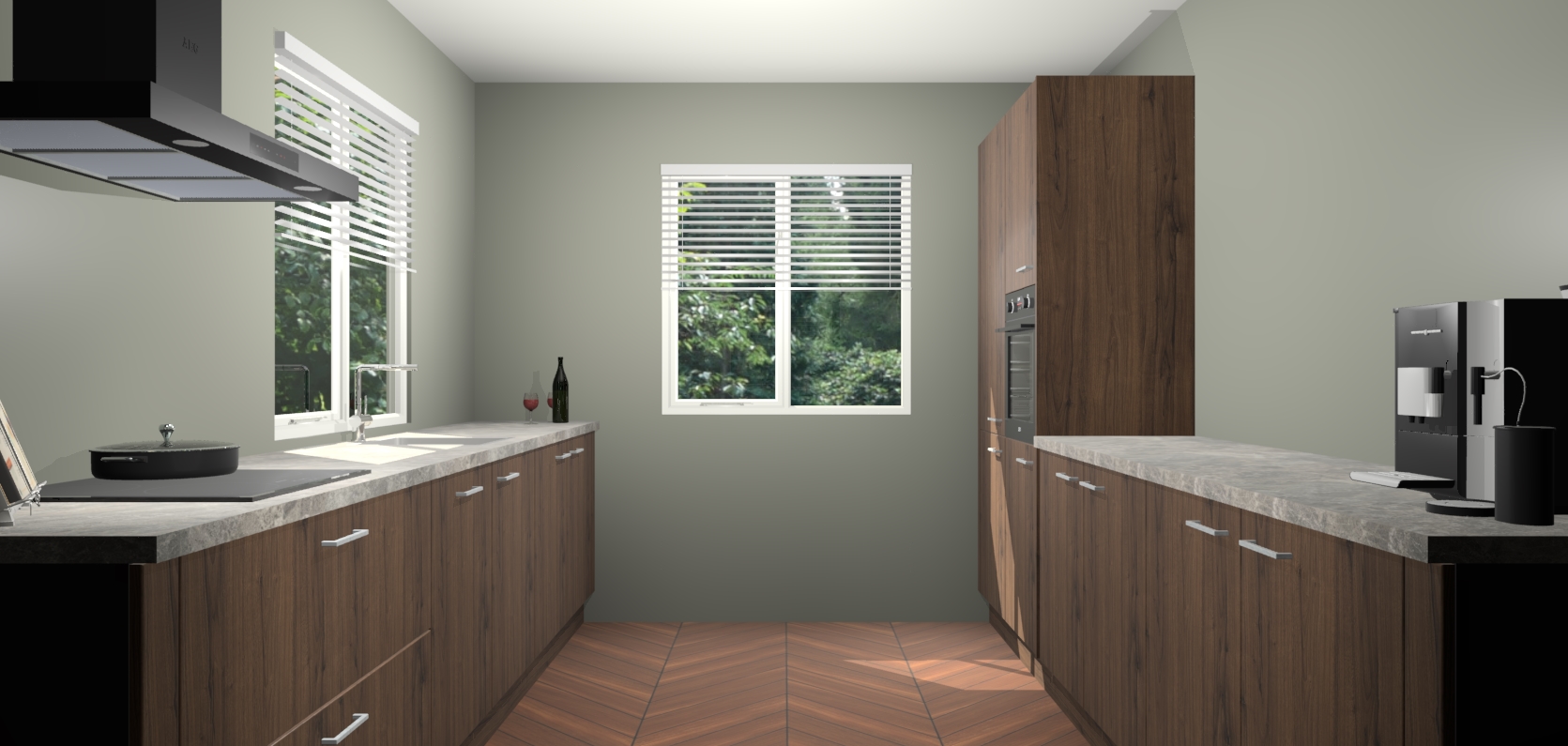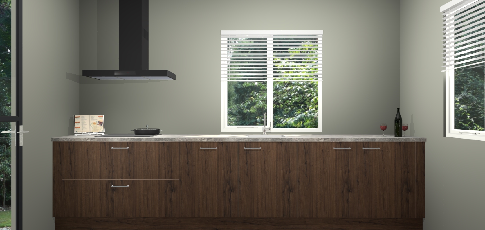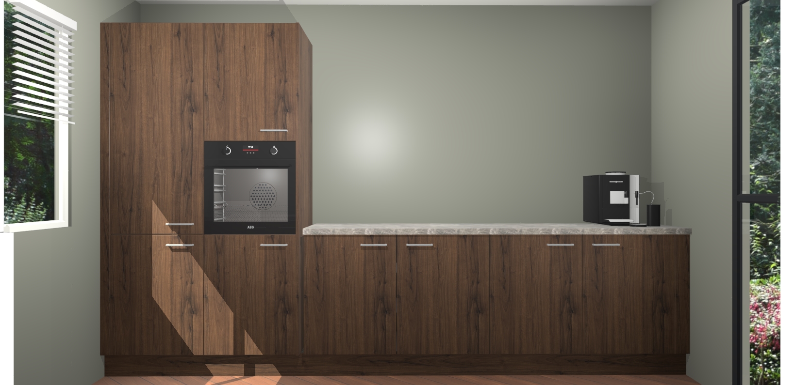 Welkom bij de Noten keuken Lusaka. Deze prachtige keuken zal de komende jaren het middelpunt van de belangstelling in uw huis zijn. Uitgerust met vijf inbouwapparaten komt u nooit kookgereedschap tekort. Bovendien geeft de warme houtlook elke ruimte een uitnodigende en tijdloze uitstraling.