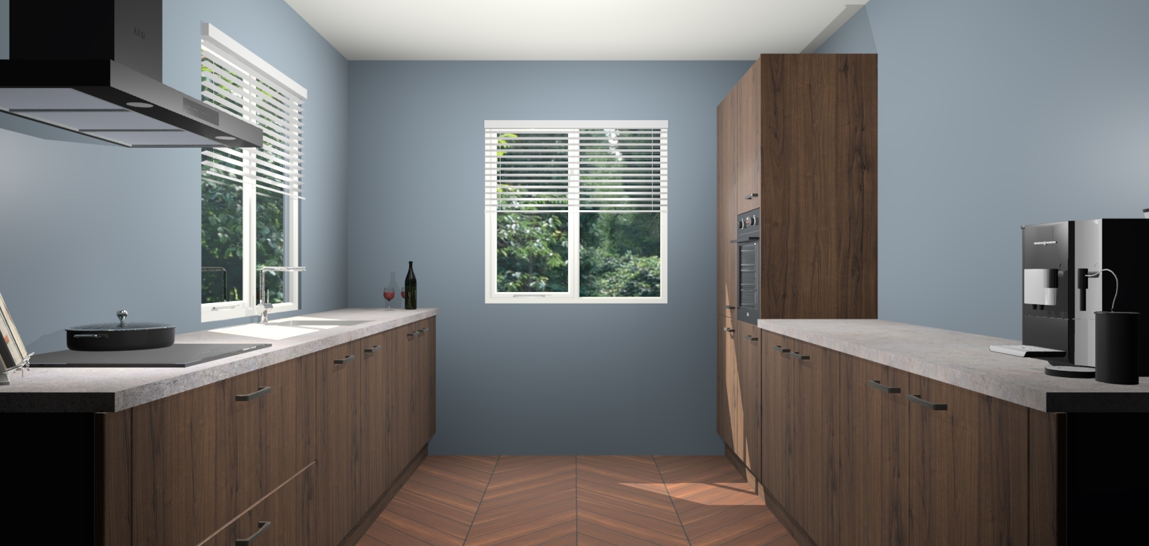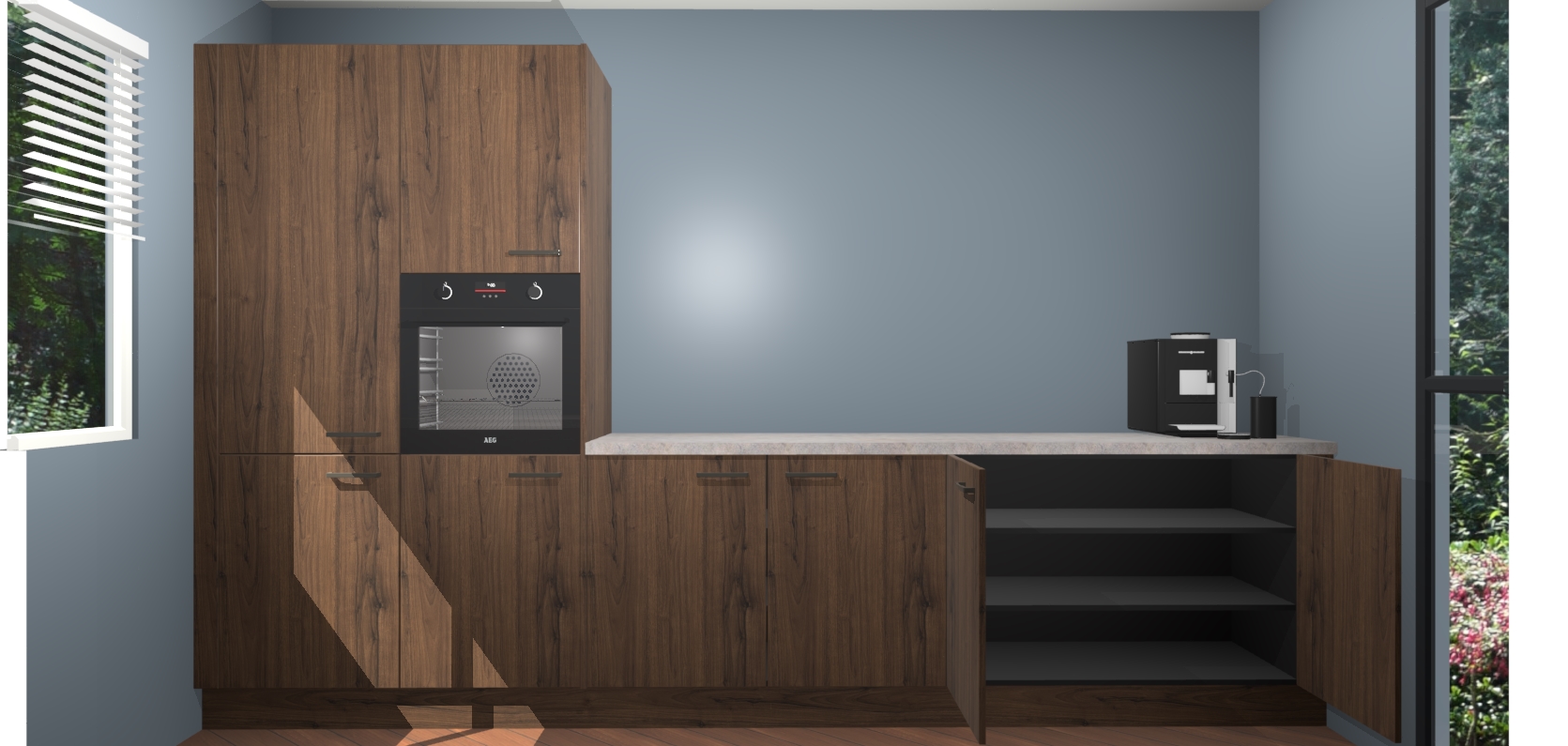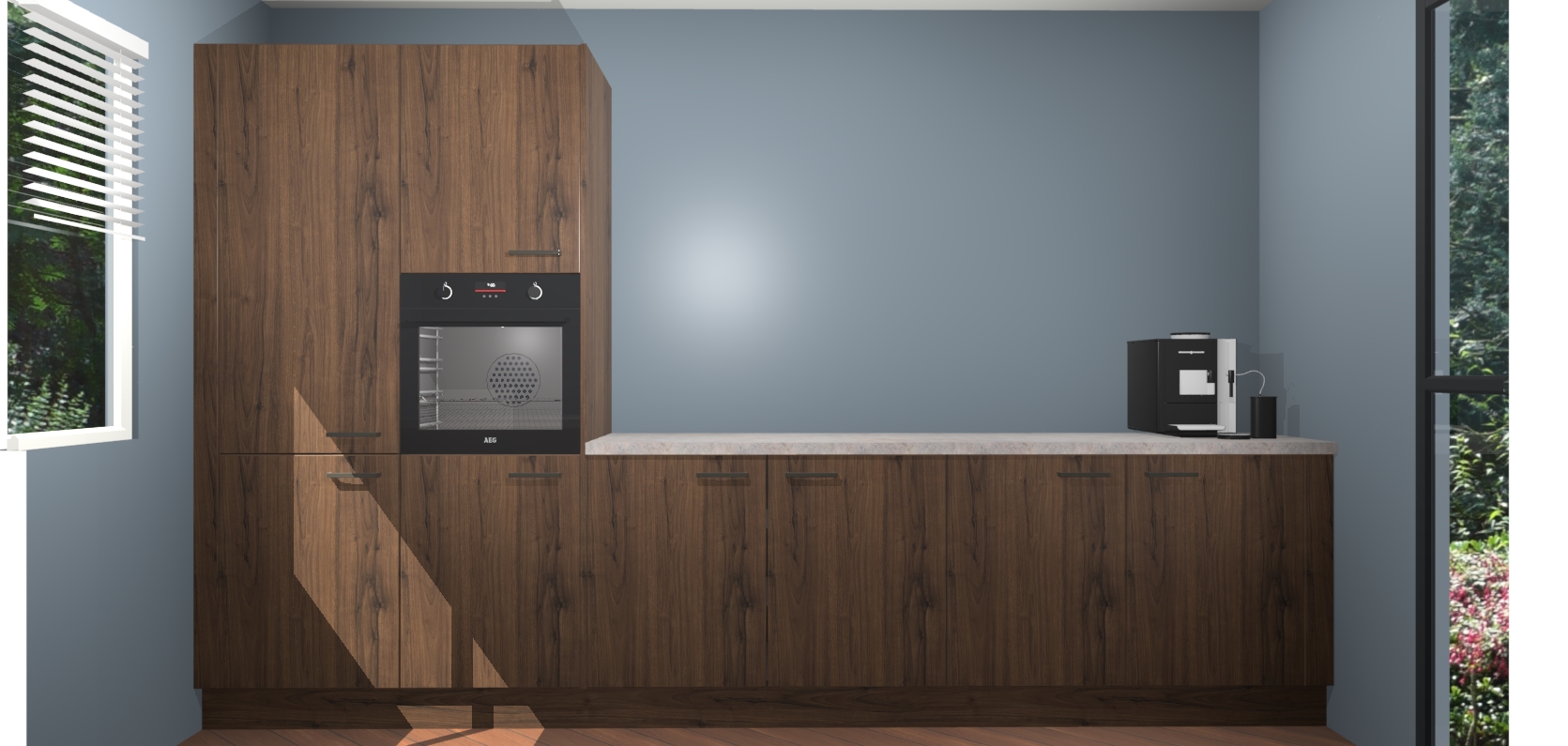 Welkom bij de Noten keuken Lusaka. Deze prachtige keuken zal de komende jaren het middelpunt van de belangstelling in uw huis zijn. Uitgerust met vijf inbouwapparaten komt u nooit kookgereedschap tekort. Bovendien geeft de warme houtlook elke ruimte een uitnodigende en tijdloze uitstraling.