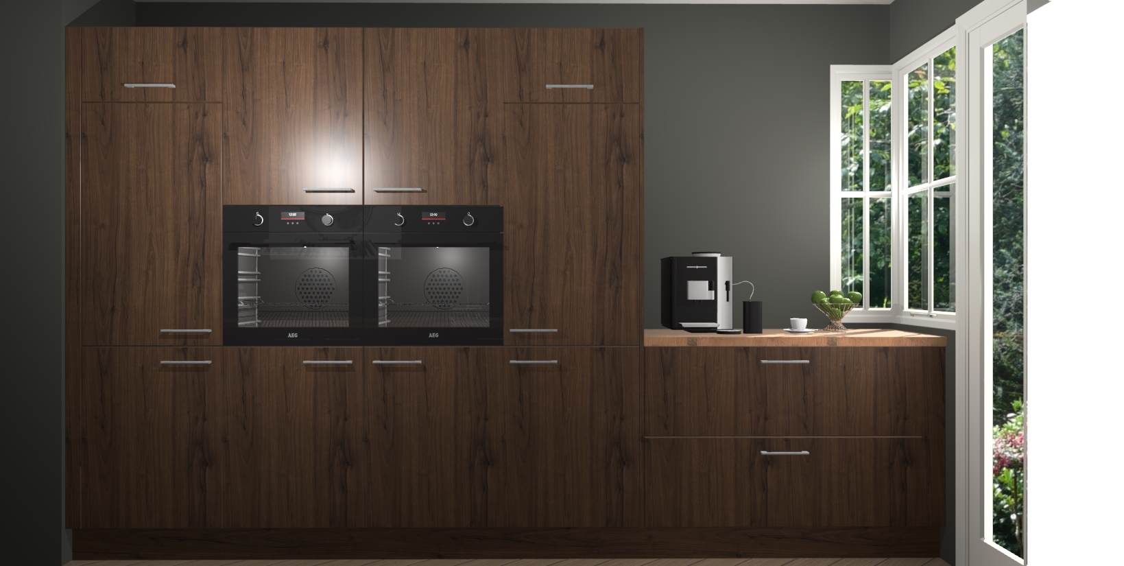 Een stijlvolle en praktische keuken als deze mag gezien worden. Dankzij de prachtige noten matte afwerking wordt de keuken gemakkelijk het middelpunt van uw huis - hij ziet er geweldig uit onder allerlei lichtomstandigheden, van dag tot nacht!