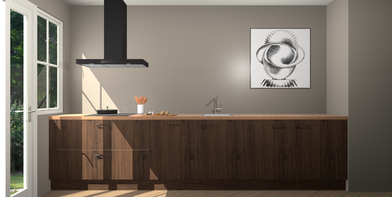 Een stijlvolle en praktische keuken als deze mag gezien worden. Dankzij de prachtige noten matte afwerking wordt de keuken gemakkelijk het middelpunt van uw huis - hij ziet er geweldig uit onder allerlei lichtomstandigheden, van dag tot nacht!