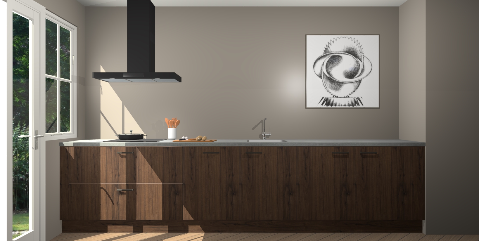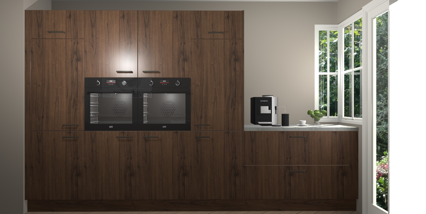 Een stijlvolle en praktische keuken als deze mag gezien worden. Dankzij de prachtige noten matte afwerking wordt de keuken gemakkelijk het middelpunt van uw huis - hij ziet er geweldig uit onder allerlei lichtomstandigheden, van dag tot nacht!