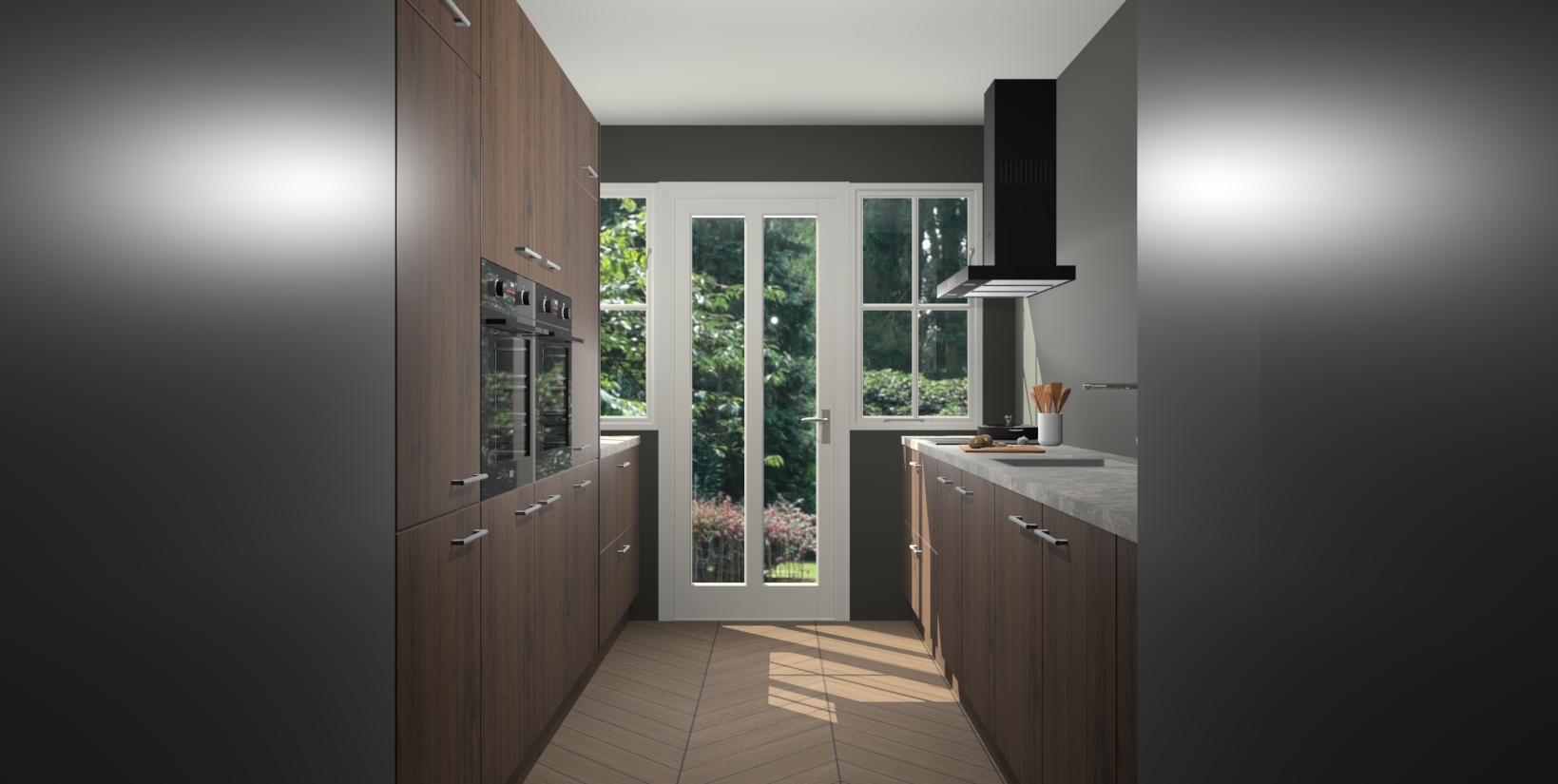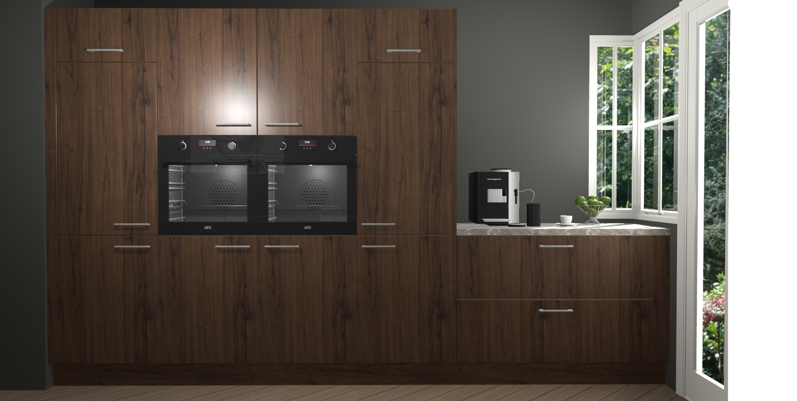 Een stijlvolle en praktische keuken als deze mag gezien worden. Dankzij de prachtige noten matte afwerking wordt de keuken gemakkelijk het middelpunt van uw huis - hij ziet er geweldig uit onder allerlei lichtomstandigheden, van dag tot nacht!