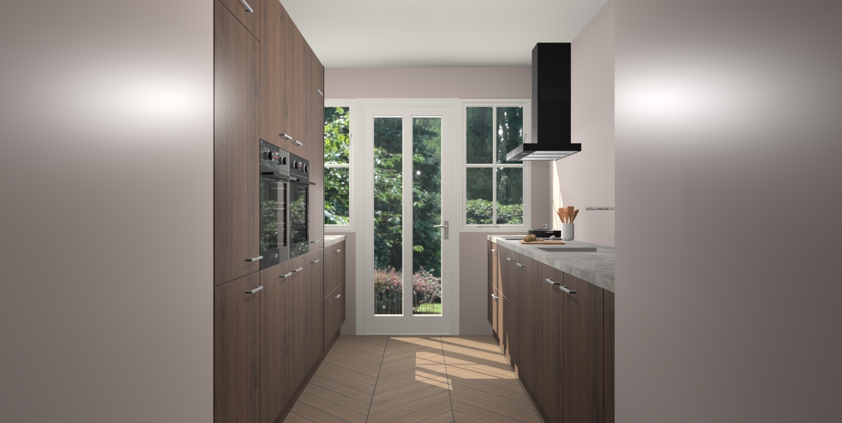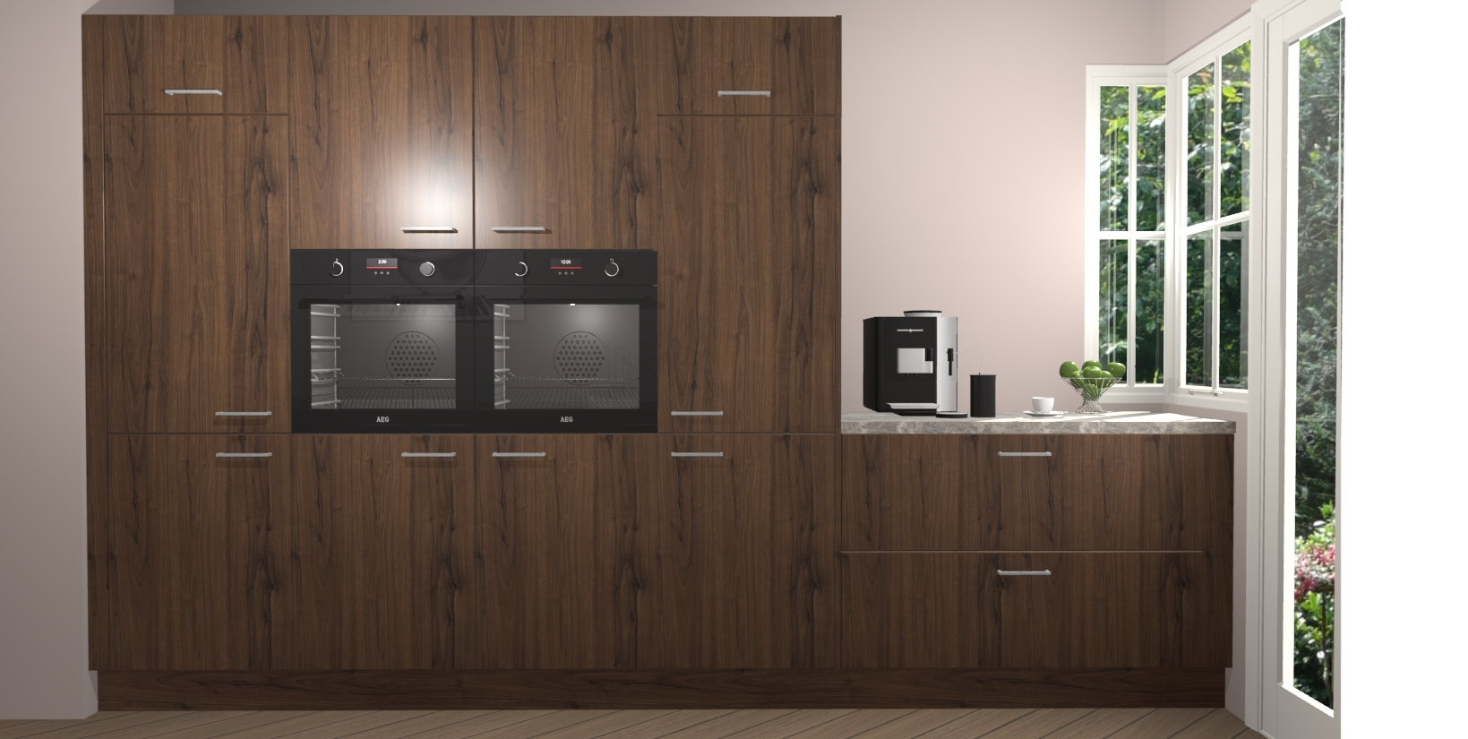 Een stijlvolle en praktische keuken als deze mag gezien worden. Dankzij de prachtige noten matte afwerking wordt de keuken gemakkelijk het middelpunt van uw huis - hij ziet er geweldig uit onder allerlei lichtomstandigheden, van dag tot nacht!