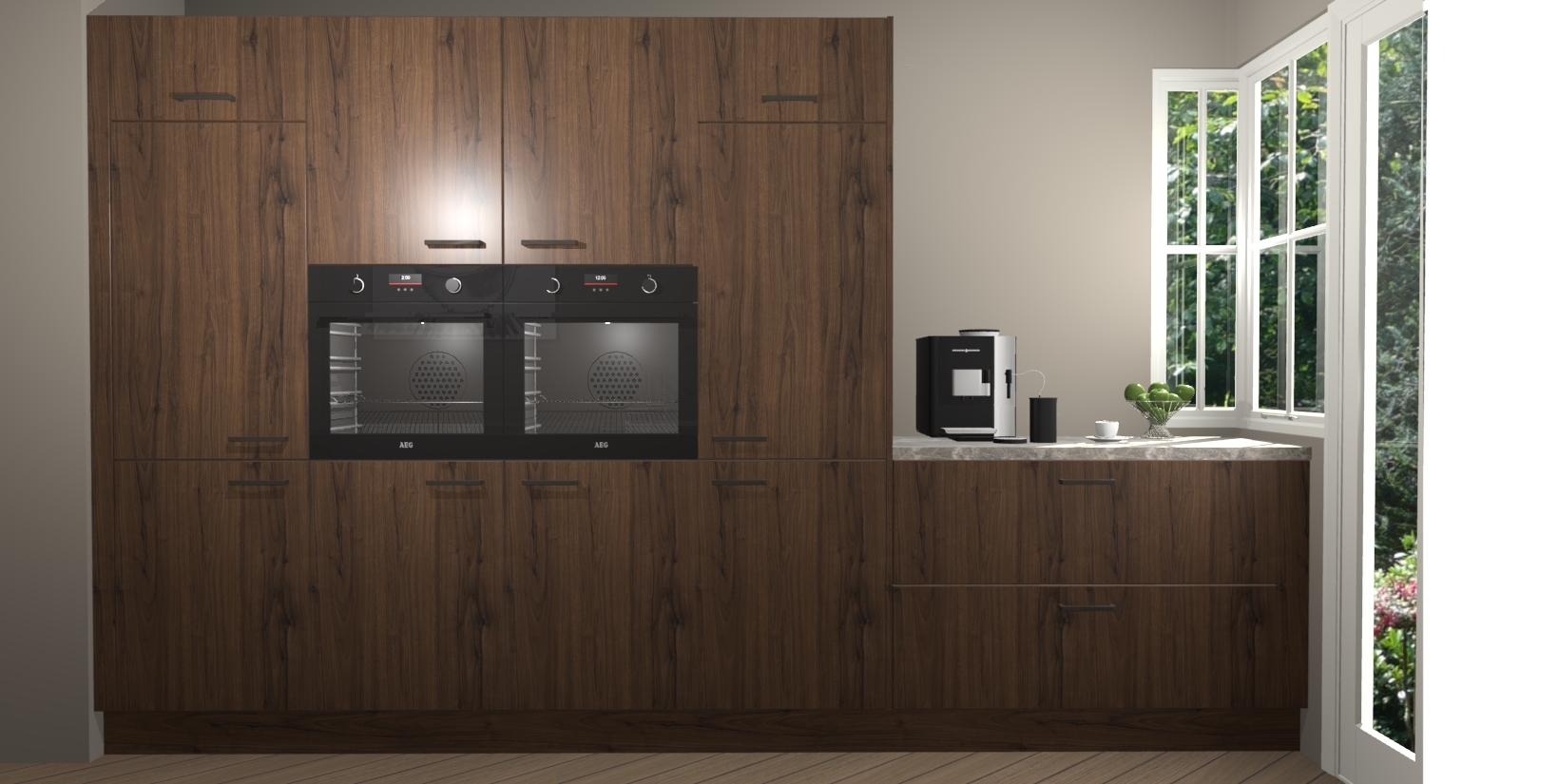 Een stijlvolle en praktische keuken als deze mag gezien worden. Dankzij de prachtige noten matte afwerking wordt de keuken gemakkelijk het middelpunt van uw huis - hij ziet er geweldig uit onder allerlei lichtomstandigheden, van dag tot nacht!
