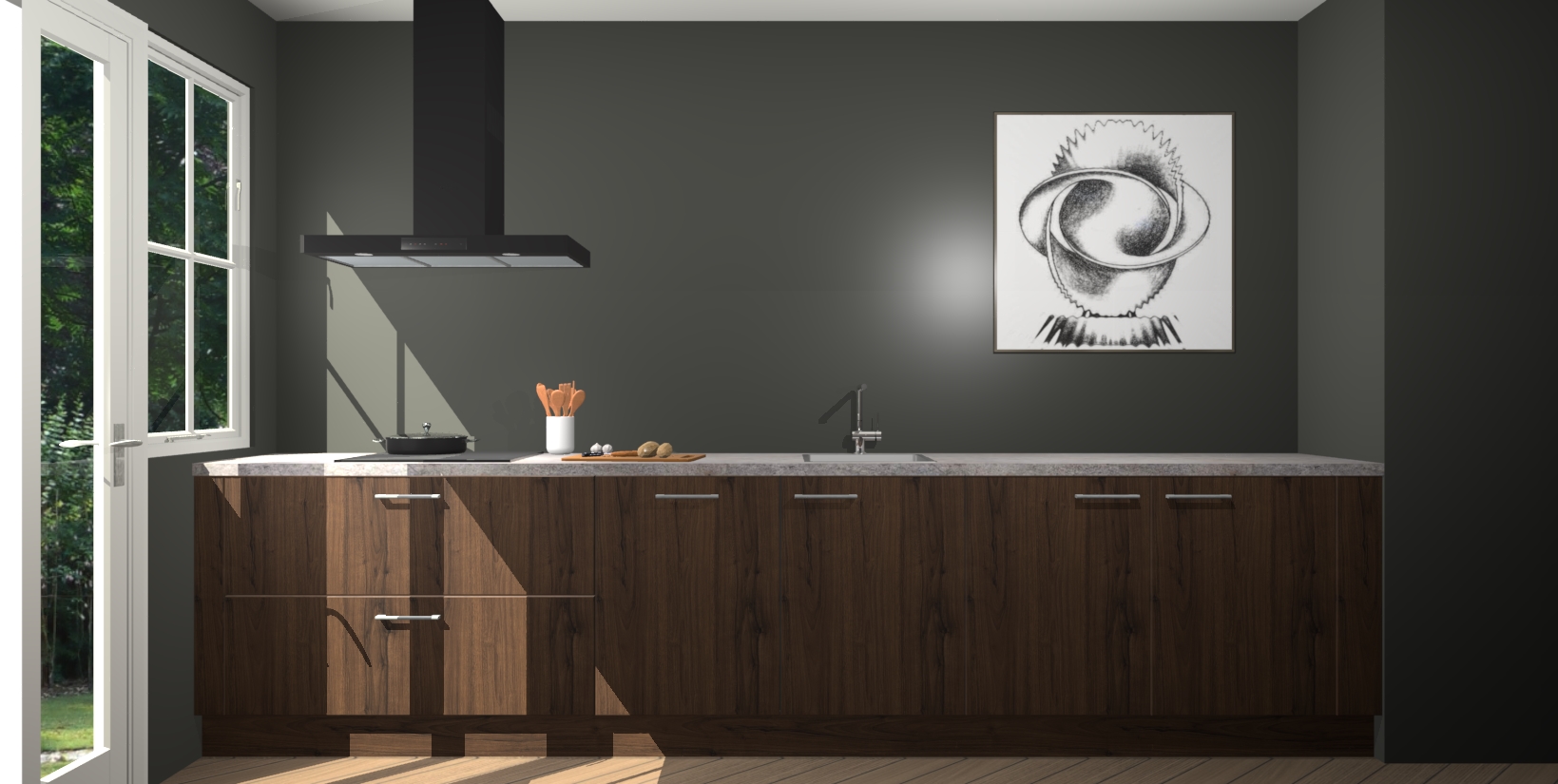Een stijlvolle en praktische keuken als deze mag gezien worden. Dankzij de prachtige noten matte afwerking wordt de keuken gemakkelijk het middelpunt van uw huis - hij ziet er geweldig uit onder allerlei lichtomstandigheden, van dag tot nacht!