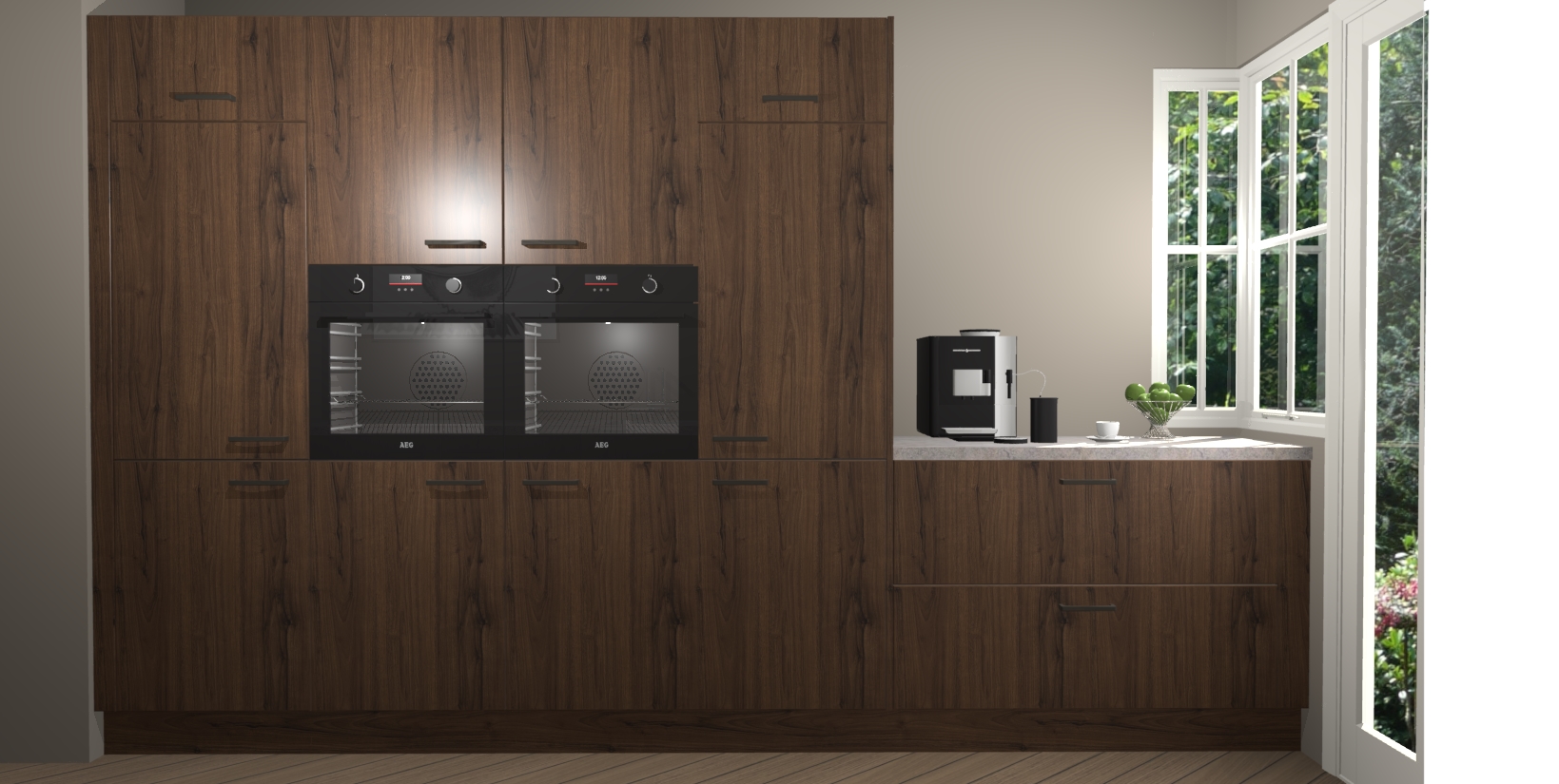 Een stijlvolle en praktische keuken als deze mag gezien worden. Dankzij de prachtige noten matte afwerking wordt de keuken gemakkelijk het middelpunt van uw huis - hij ziet er geweldig uit onder allerlei lichtomstandigheden, van dag tot nacht!