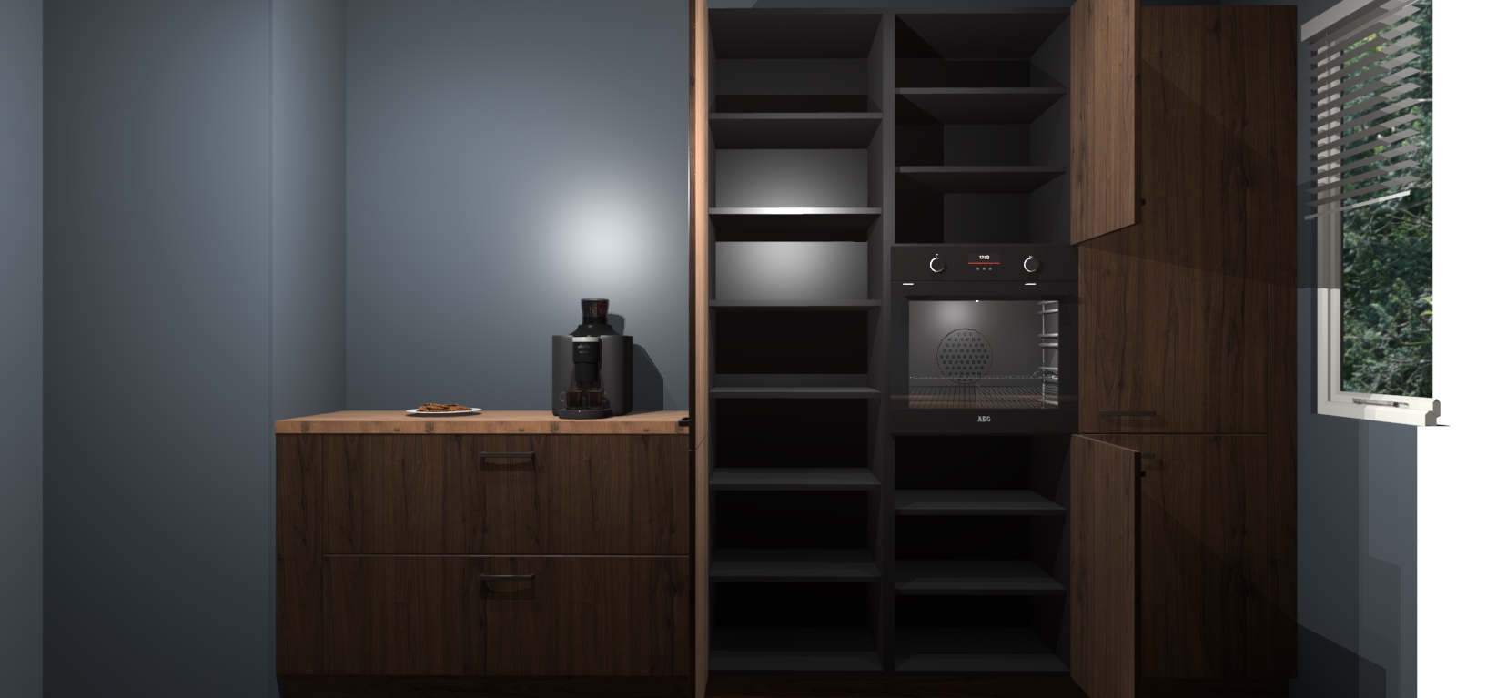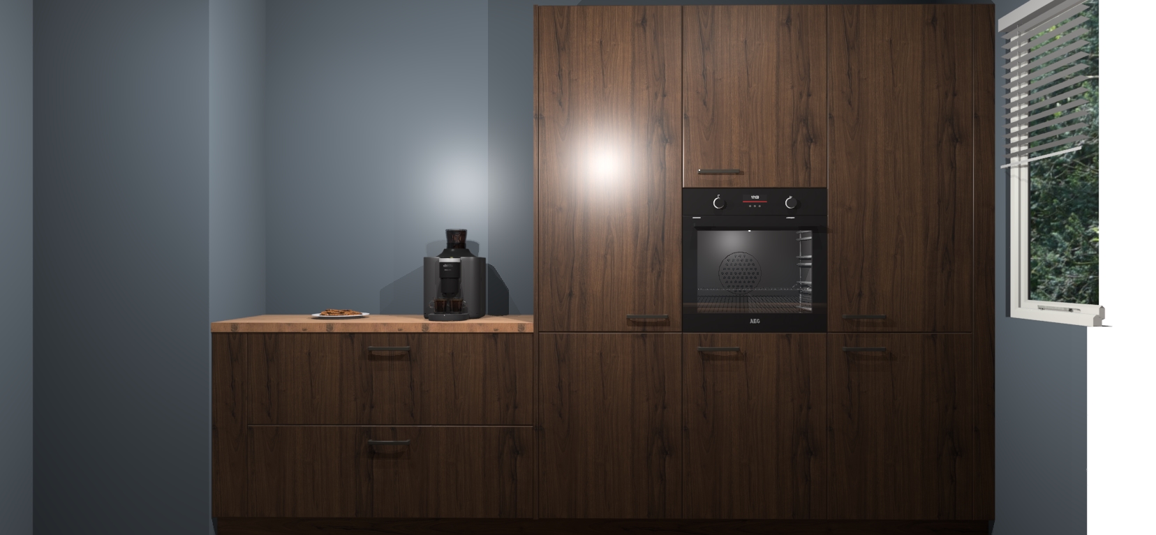 Een stijlvolle en praktische keuken als deze mag gezien worden. Dankzij de prachtige Noten matte afwerking wordt de keuken gemakkelijk het middelpunt van uw huis - hij ziet er geweldig uit onder allerlei lichtomstandigheden, van dag tot nacht!