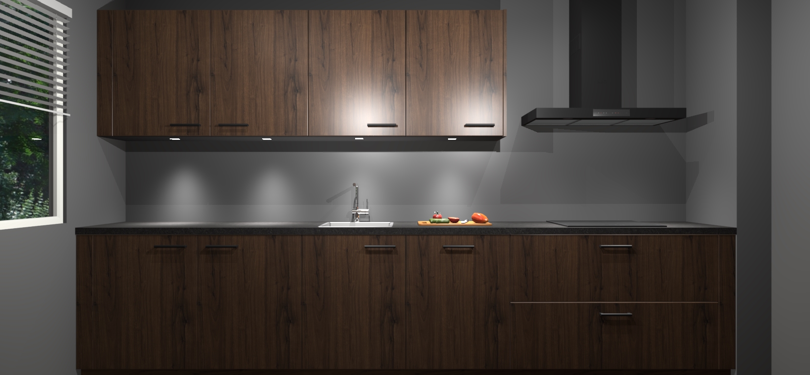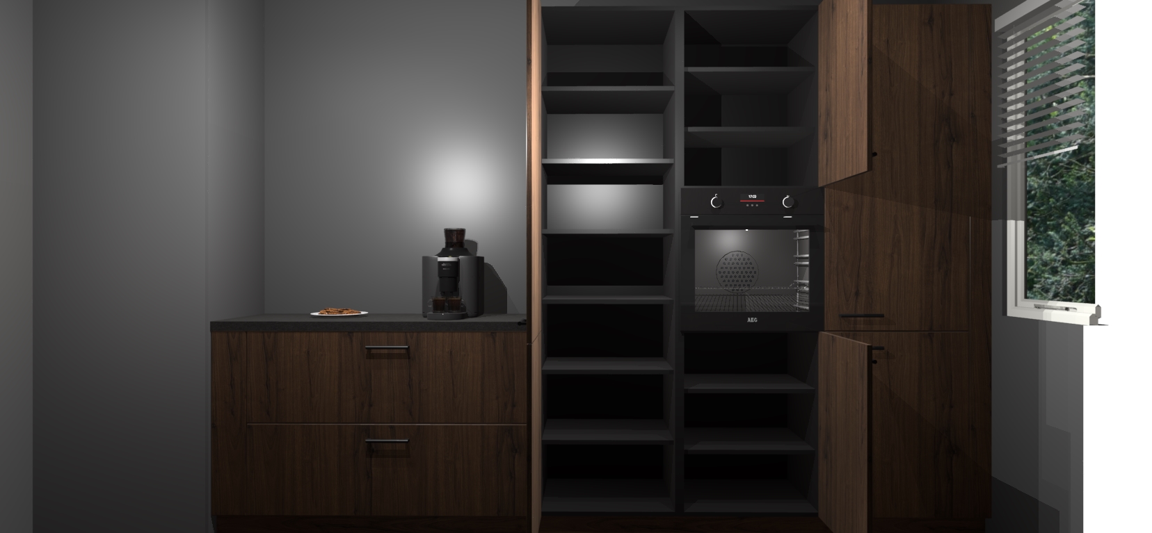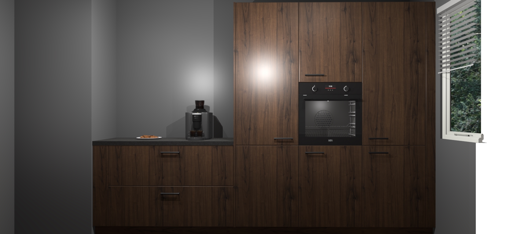 Een stijlvolle en praktische keuken als deze mag gezien worden. Dankzij de prachtige Noten matte afwerking wordt de keuken gemakkelijk het middelpunt van uw huis - hij ziet er geweldig uit onder allerlei lichtomstandigheden, van dag tot nacht!