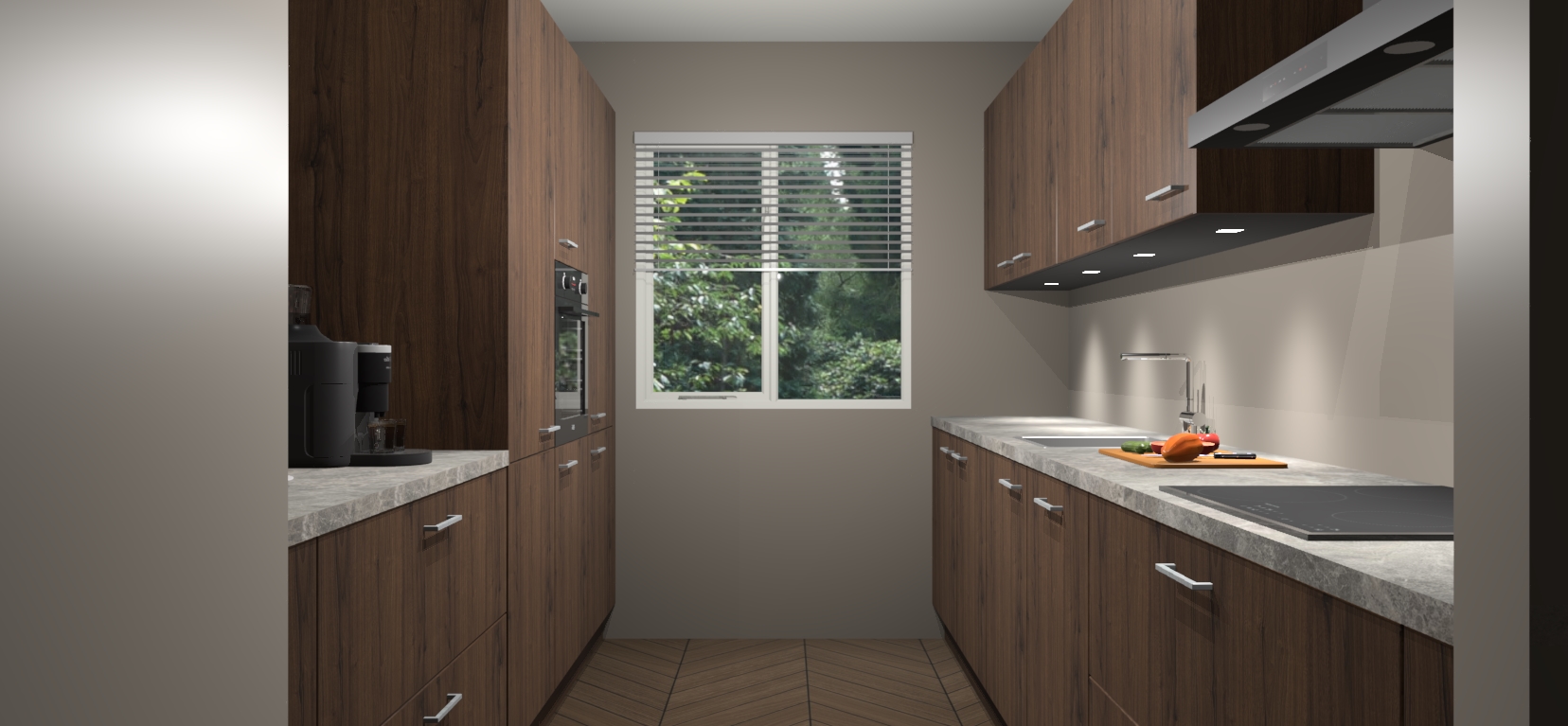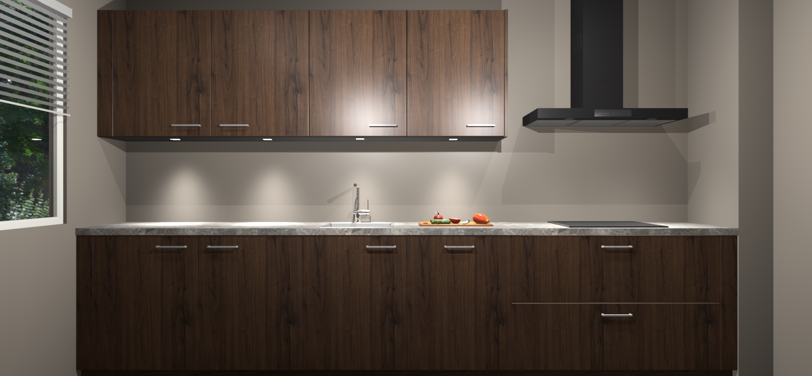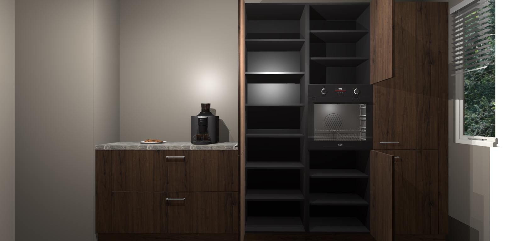 Een stijlvolle en praktische keuken als deze mag gezien worden. Dankzij de prachtige Noten matte afwerking wordt de keuken gemakkelijk het middelpunt van uw huis - hij ziet er geweldig uit onder allerlei lichtomstandigheden, van dag tot nacht!