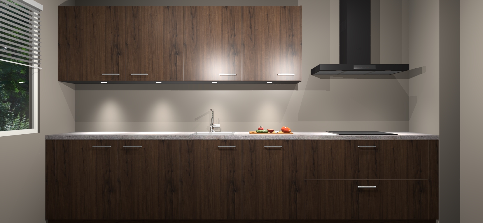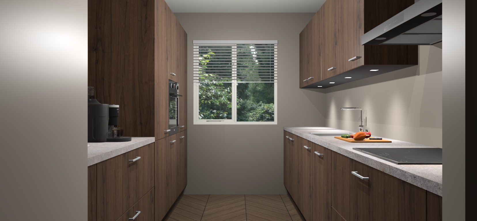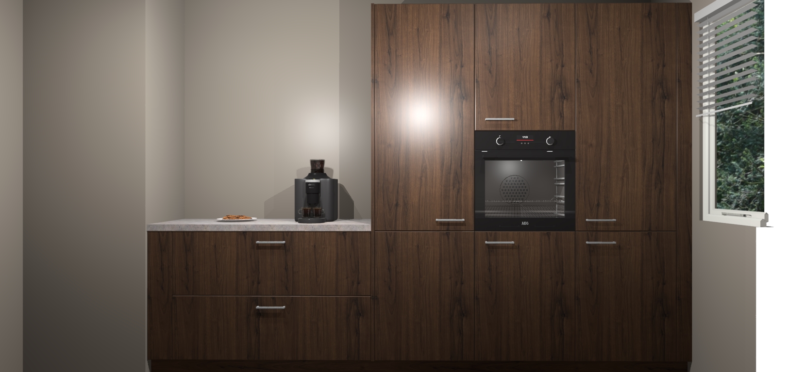 Een stijlvolle en praktische keuken als deze mag gezien worden. Dankzij de prachtige Noten matte afwerking wordt de keuken gemakkelijk het middelpunt van uw huis - hij ziet er geweldig uit onder allerlei lichtomstandigheden, van dag tot nacht!
