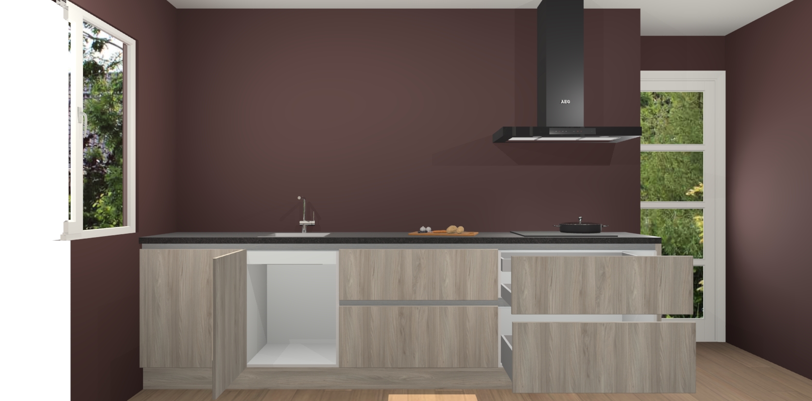 De softclose deuren openen en sluiten is ook heel eenvoudig - geniet van een moeiteloze keukenervaring, zelfs als er kinderen rondlopen. Voor extra gemak bij het plaatsen van uw bestelling bieden we ook een upgrade naar een kookplaat met geïntegreerde afzuiging.