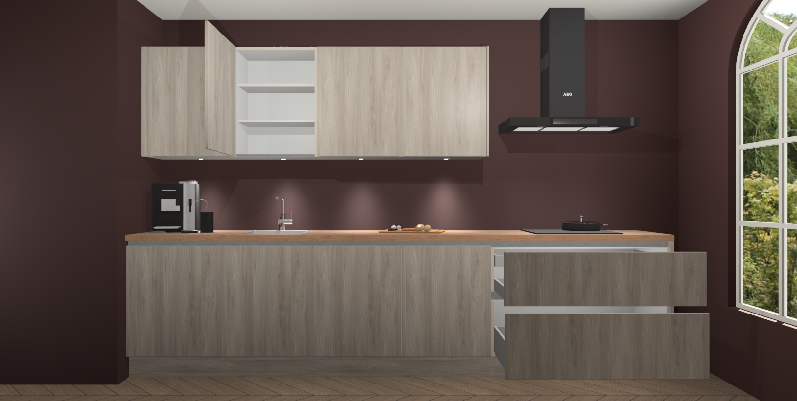 De softclose deuren openen en sluiten is ook heel eenvoudig - geniet van een moeiteloze keukenervaring, zelfs als er kinderen rondlopen. Voor extra gemak bij het plaatsen van uw bestelling bieden we ook een upgrade naar een kookplaat met geïntegreerde afzuiging.