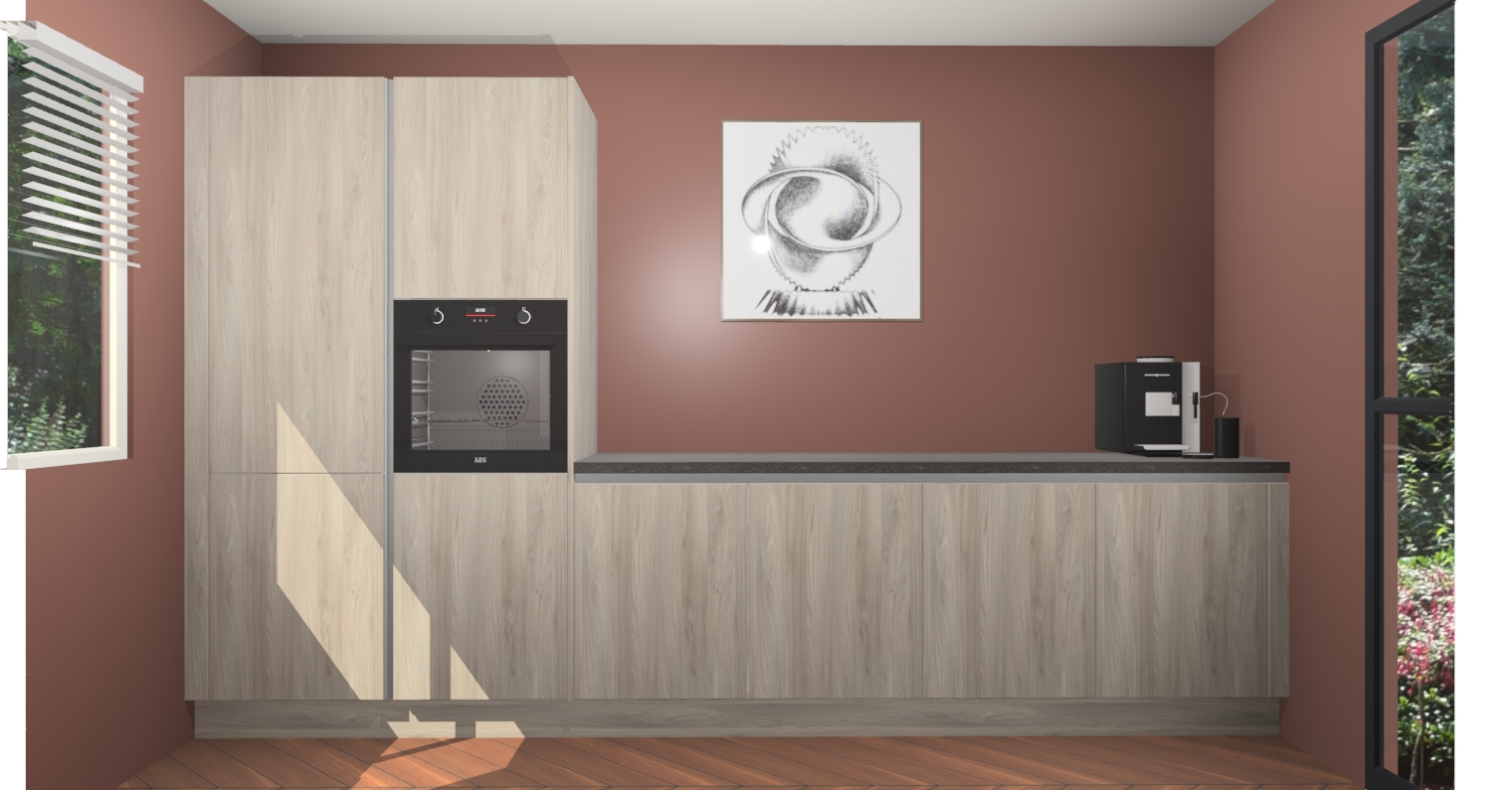 Welkom bij de Olm greeploze keuken Lusaka. Deze prachtige keuken zal de komende jaren het middelpunt van de belangstelling in uw huis zijn. Uitgerust met vijf inbouwapparaten komt u nooit kookgereedschap tekort. Bovendien geeft de warme houtlook elke ruimte een uitnodigende en tijdloze uitstraling.