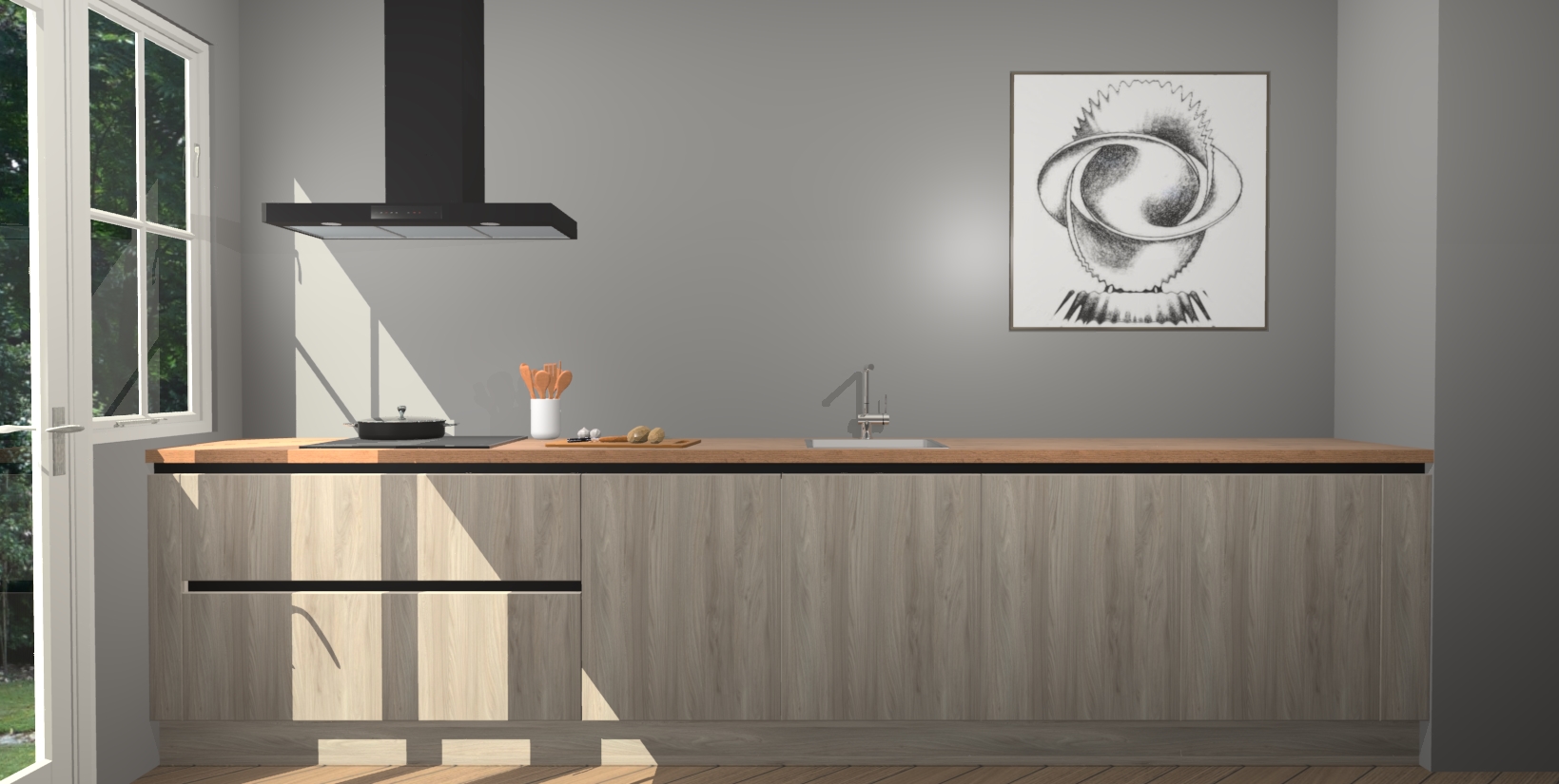 Een stijlvolle en praktische keuken als deze mag gezien worden. Dankzij de prachtige olm matte afwerking wordt de keuken gemakkelijk het middelpunt van uw huis - hij ziet er geweldig uit onder allerlei lichtomstandigheden, van dag tot nacht!