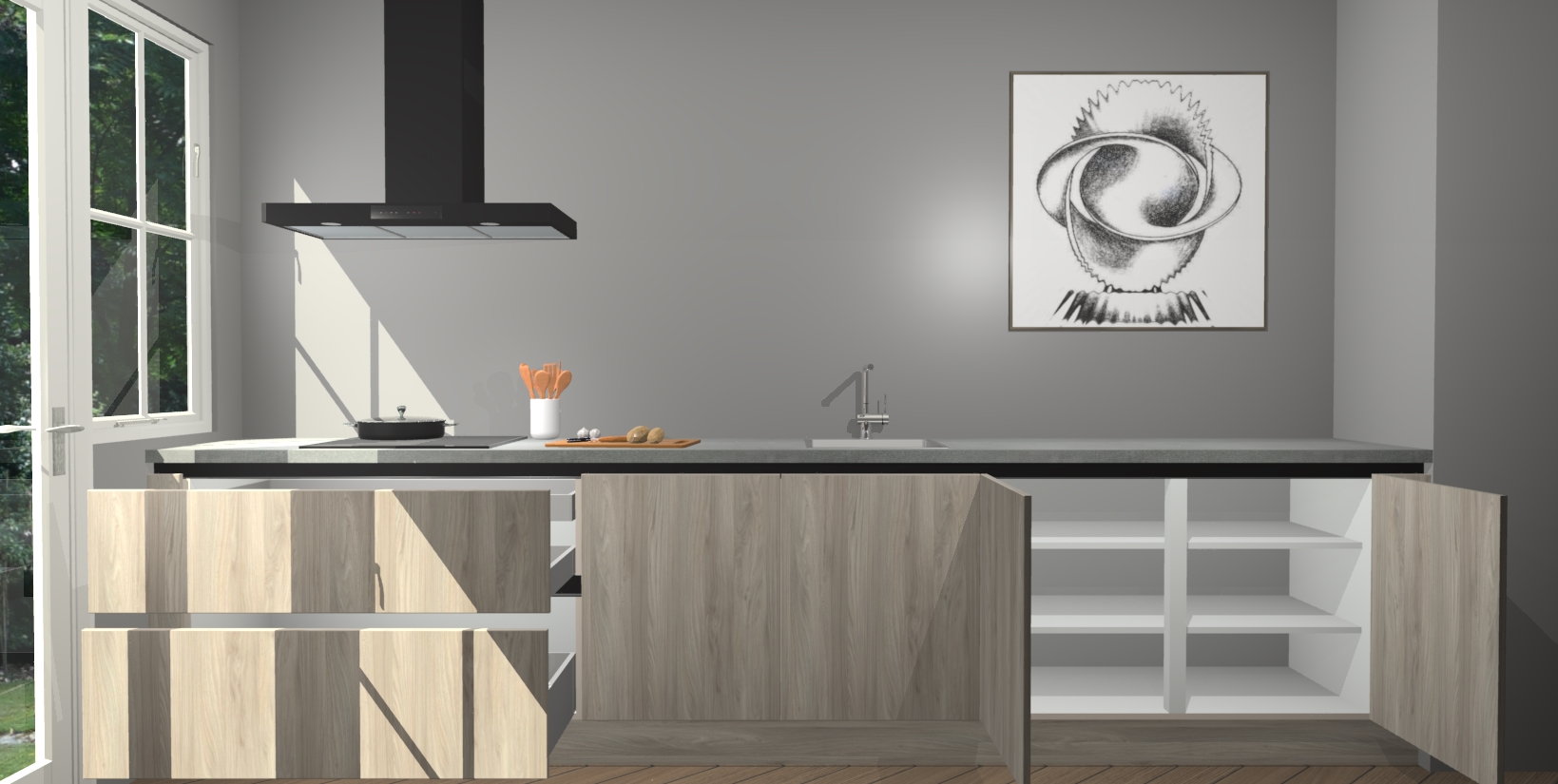 Een stijlvolle en praktische keuken als deze mag gezien worden. Dankzij de prachtige olm matte afwerking wordt de keuken gemakkelijk het middelpunt van uw huis - hij ziet er geweldig uit onder allerlei lichtomstandigheden, van dag tot nacht!