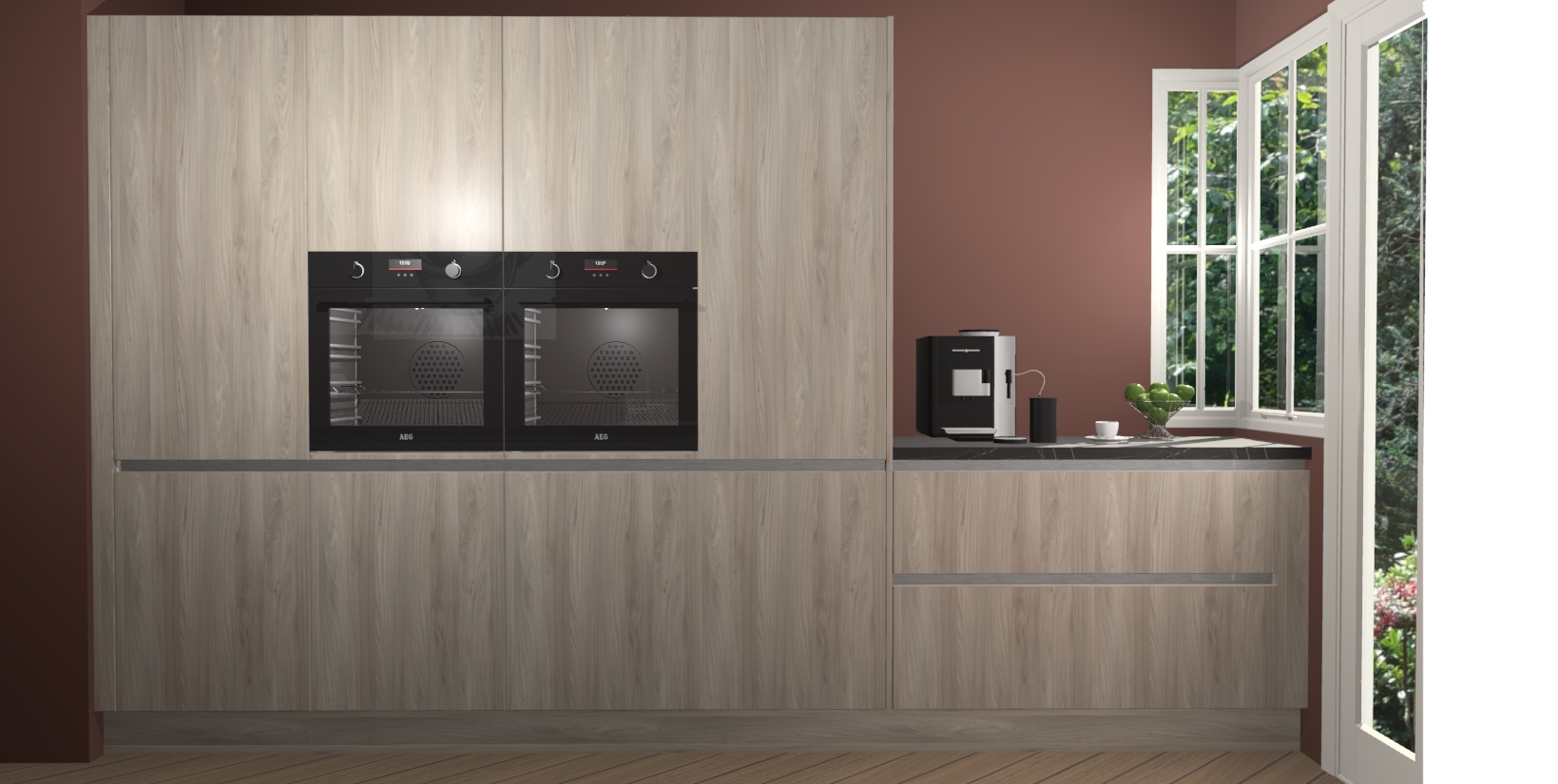 Een stijlvolle en praktische keuken als deze mag gezien worden. Dankzij de prachtige olm matte afwerking wordt de keuken gemakkelijk het middelpunt van uw huis - hij ziet er geweldig uit onder allerlei lichtomstandigheden, van dag tot nacht!