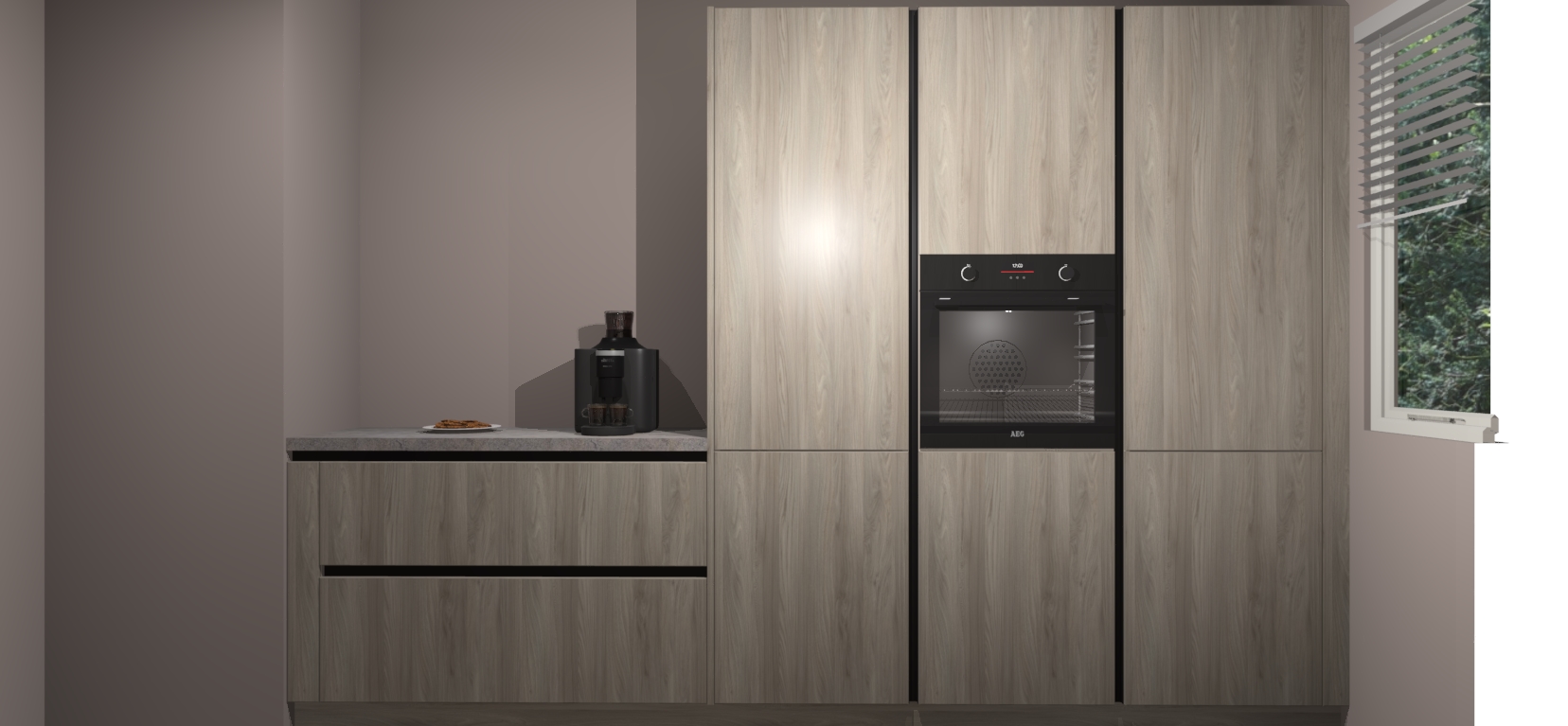 Een stijlvolle en praktische keuken als deze mag gezien worden. Dankzij de prachtige Olm matte afwerking wordt de keuken gemakkelijk het middelpunt van uw huis - hij ziet er geweldig uit onder allerlei lichtomstandigheden, van dag tot nacht!