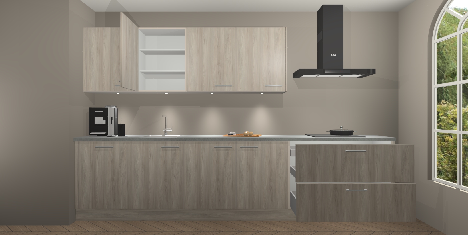 De softclose deuren openen en sluiten is ook heel eenvoudig - geniet van een moeiteloze keukenervaring, zelfs als er kinderen rondlopen. Voor extra gemak bij het plaatsen van uw bestelling bieden we ook een upgrade naar een kookplaat met geïntegreerde afzuiging.
