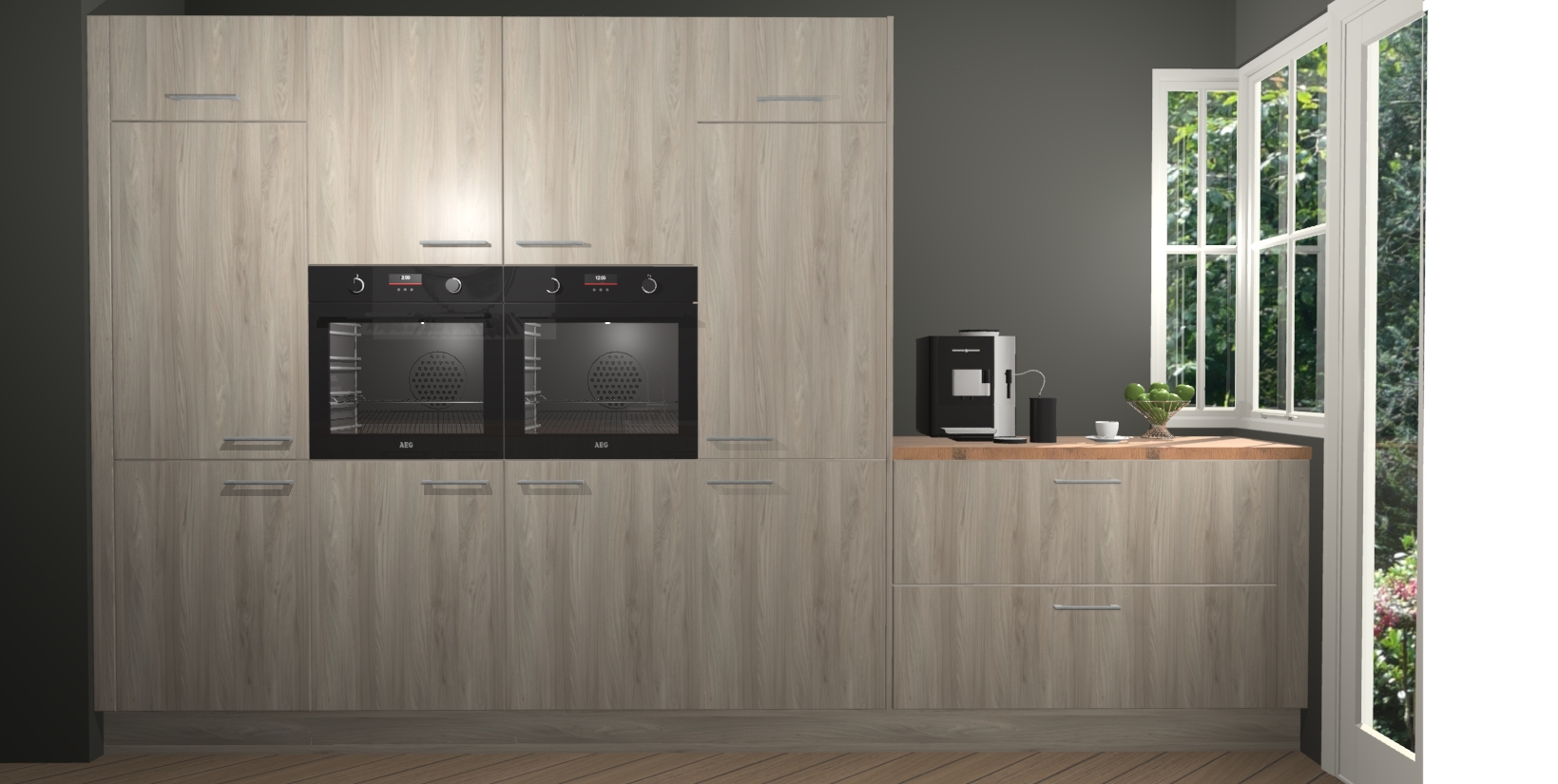 Een stijlvolle en praktische keuken als deze mag gezien worden. Dankzij de prachtige olm matte afwerking wordt de keuken gemakkelijk het middelpunt van uw huis - hij ziet er geweldig uit onder allerlei lichtomstandigheden, van dag tot nacht!