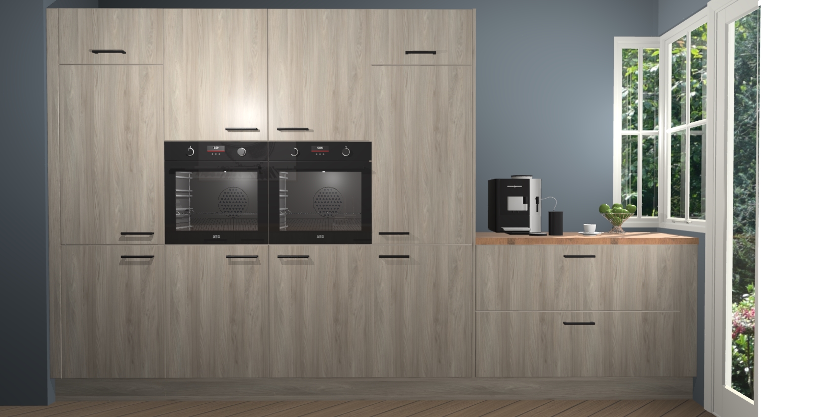 Een stijlvolle en praktische keuken als deze mag gezien worden. Dankzij de prachtige olm matte afwerking wordt de keuken gemakkelijk het middelpunt van uw huis - hij ziet er geweldig uit onder allerlei lichtomstandigheden, van dag tot nacht!
