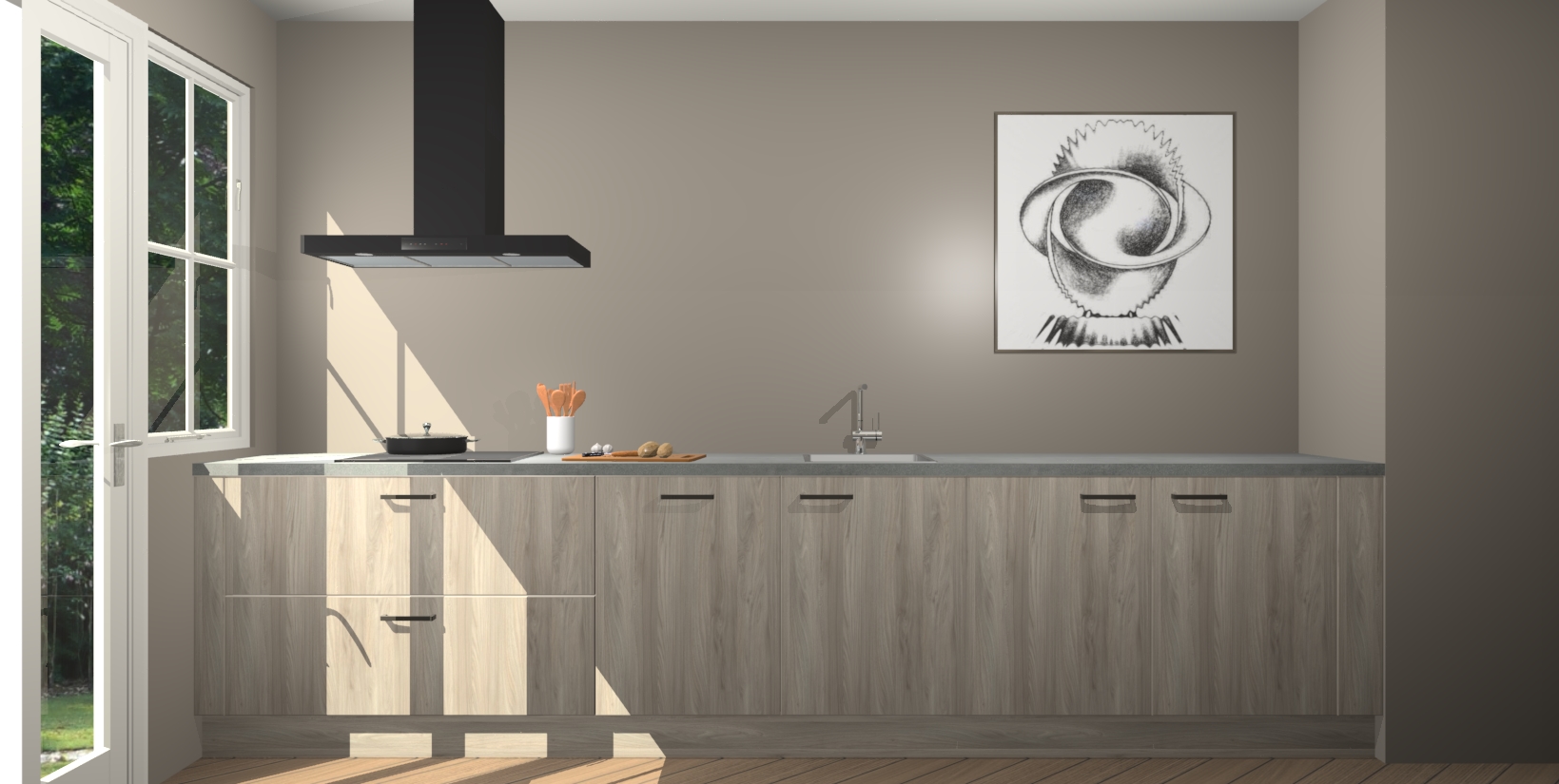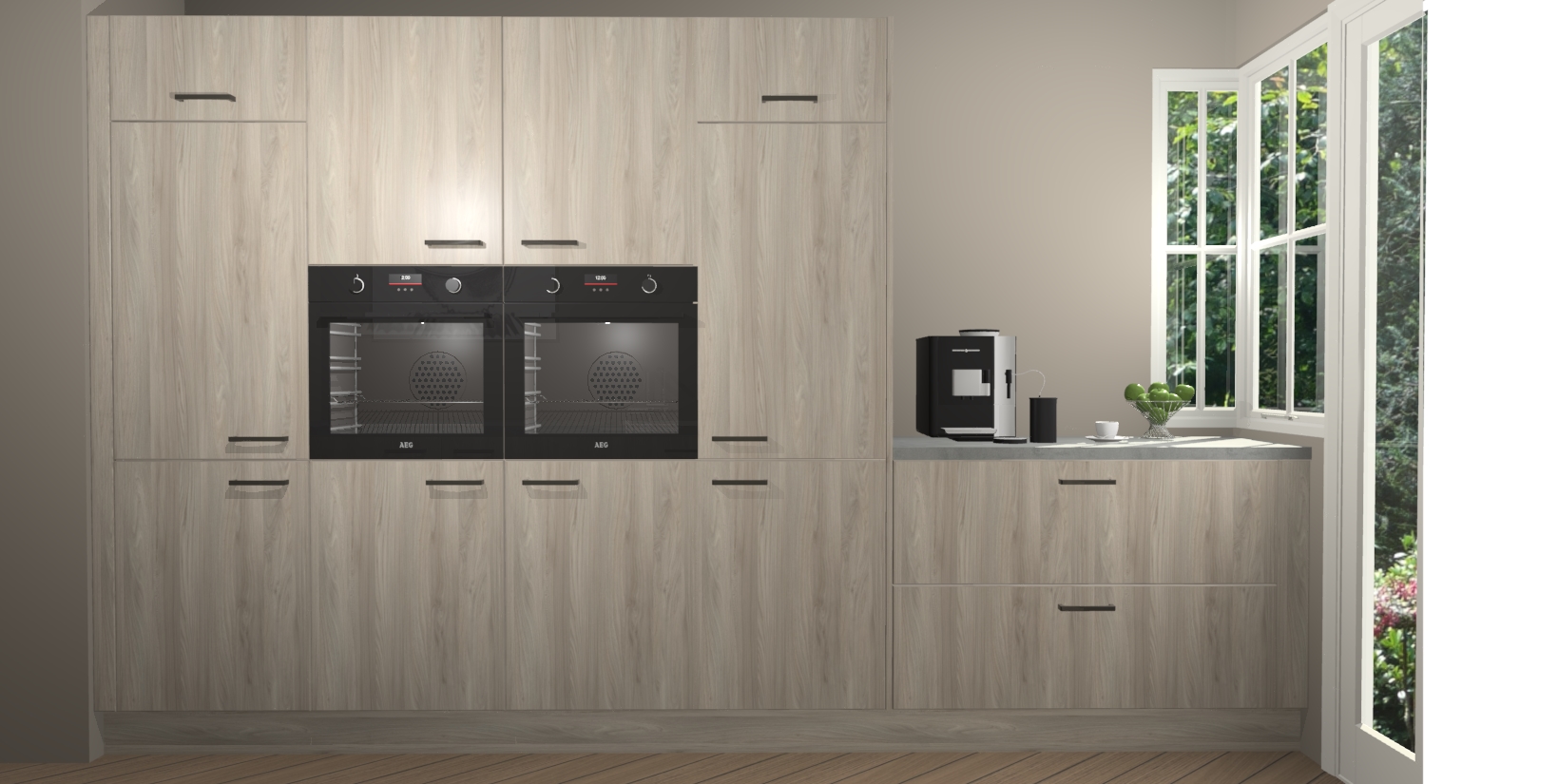 Een stijlvolle en praktische keuken als deze mag gezien worden. Dankzij de prachtige olm matte afwerking wordt de keuken gemakkelijk het middelpunt van uw huis - hij ziet er geweldig uit onder allerlei lichtomstandigheden, van dag tot nacht!