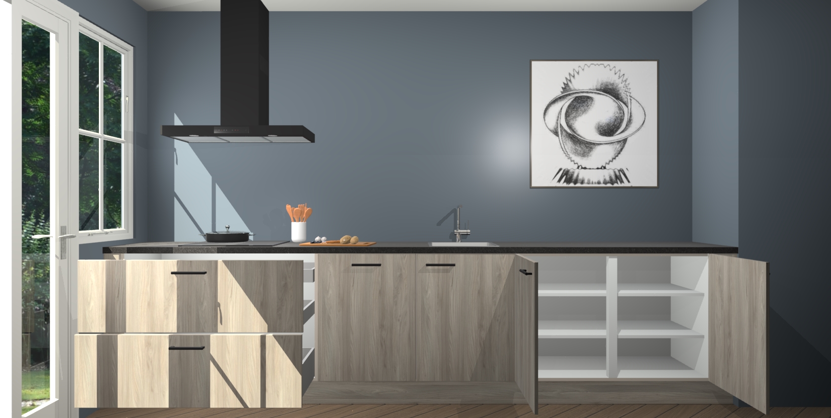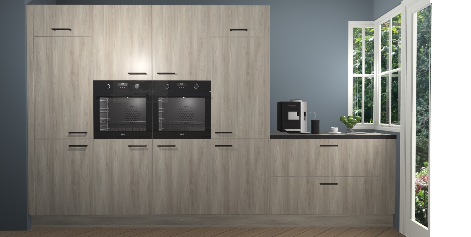 Een stijlvolle en praktische keuken als deze mag gezien worden. Dankzij de prachtige olm matte afwerking wordt de keuken gemakkelijk het middelpunt van uw huis - hij ziet er geweldig uit onder allerlei lichtomstandigheden, van dag tot nacht!