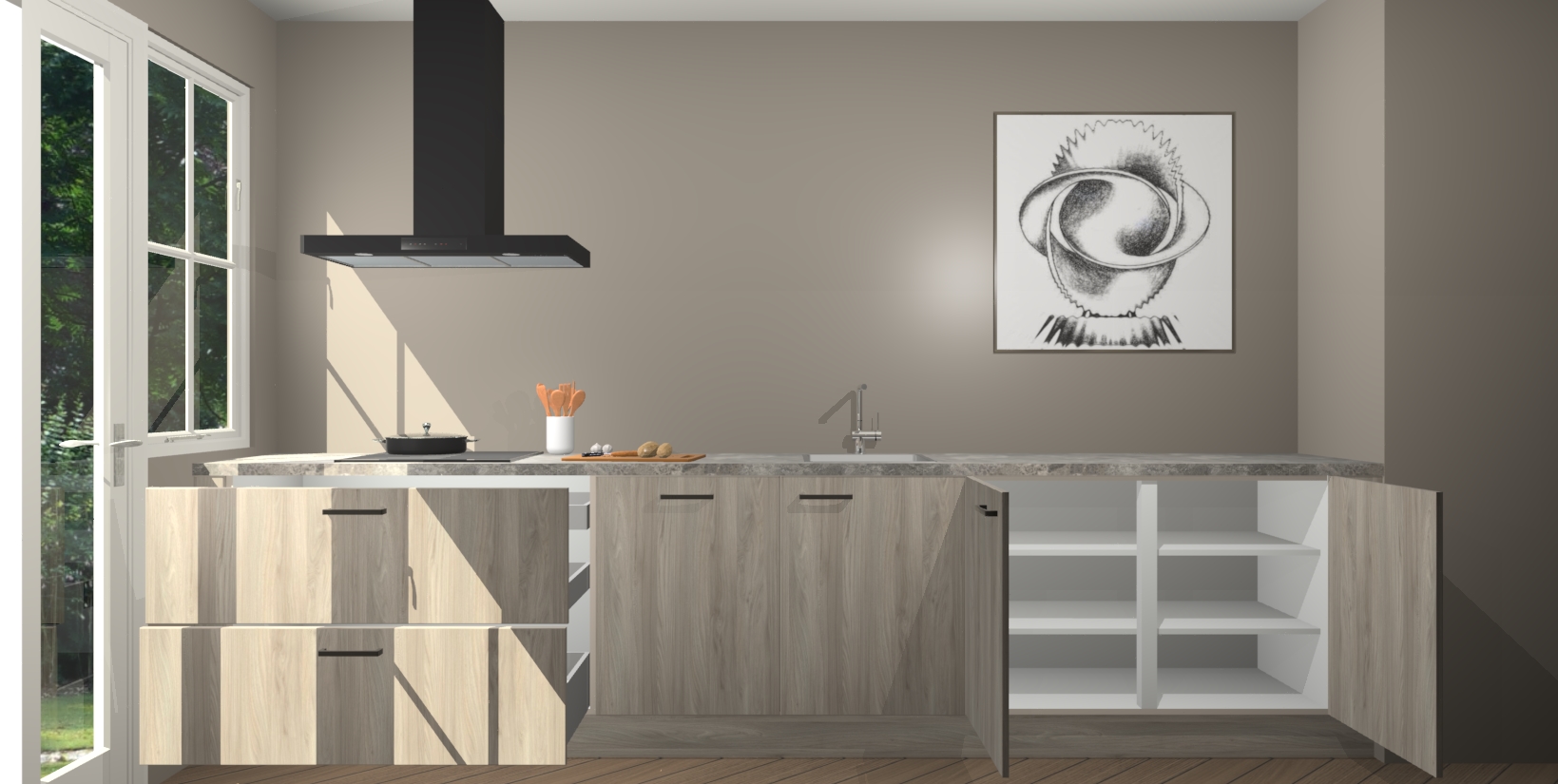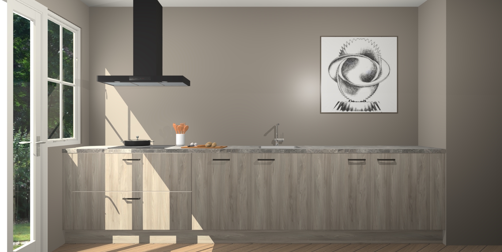 Een stijlvolle en praktische keuken als deze mag gezien worden. Dankzij de prachtige olm matte afwerking wordt de keuken gemakkelijk het middelpunt van uw huis - hij ziet er geweldig uit onder allerlei lichtomstandigheden, van dag tot nacht!