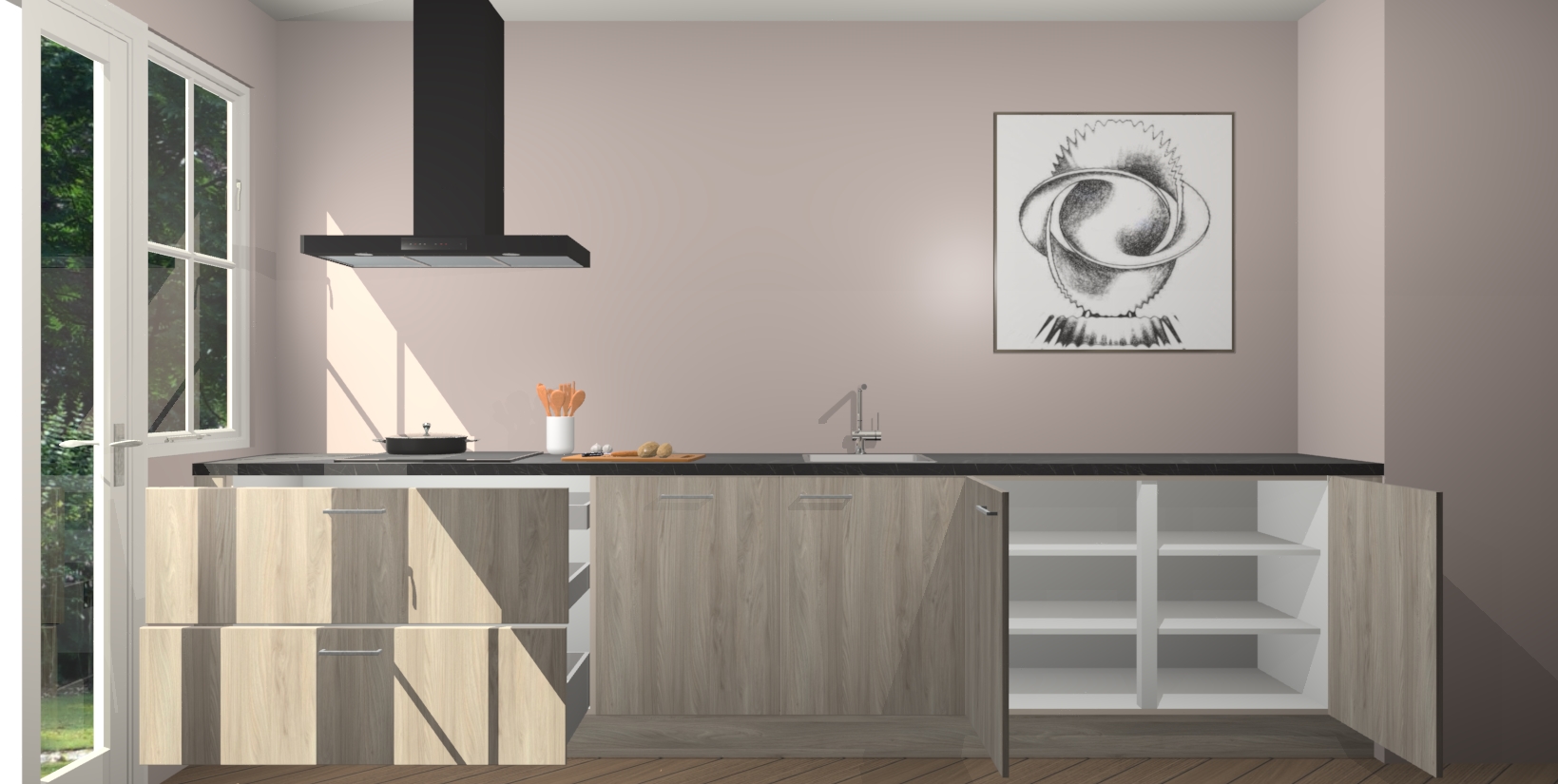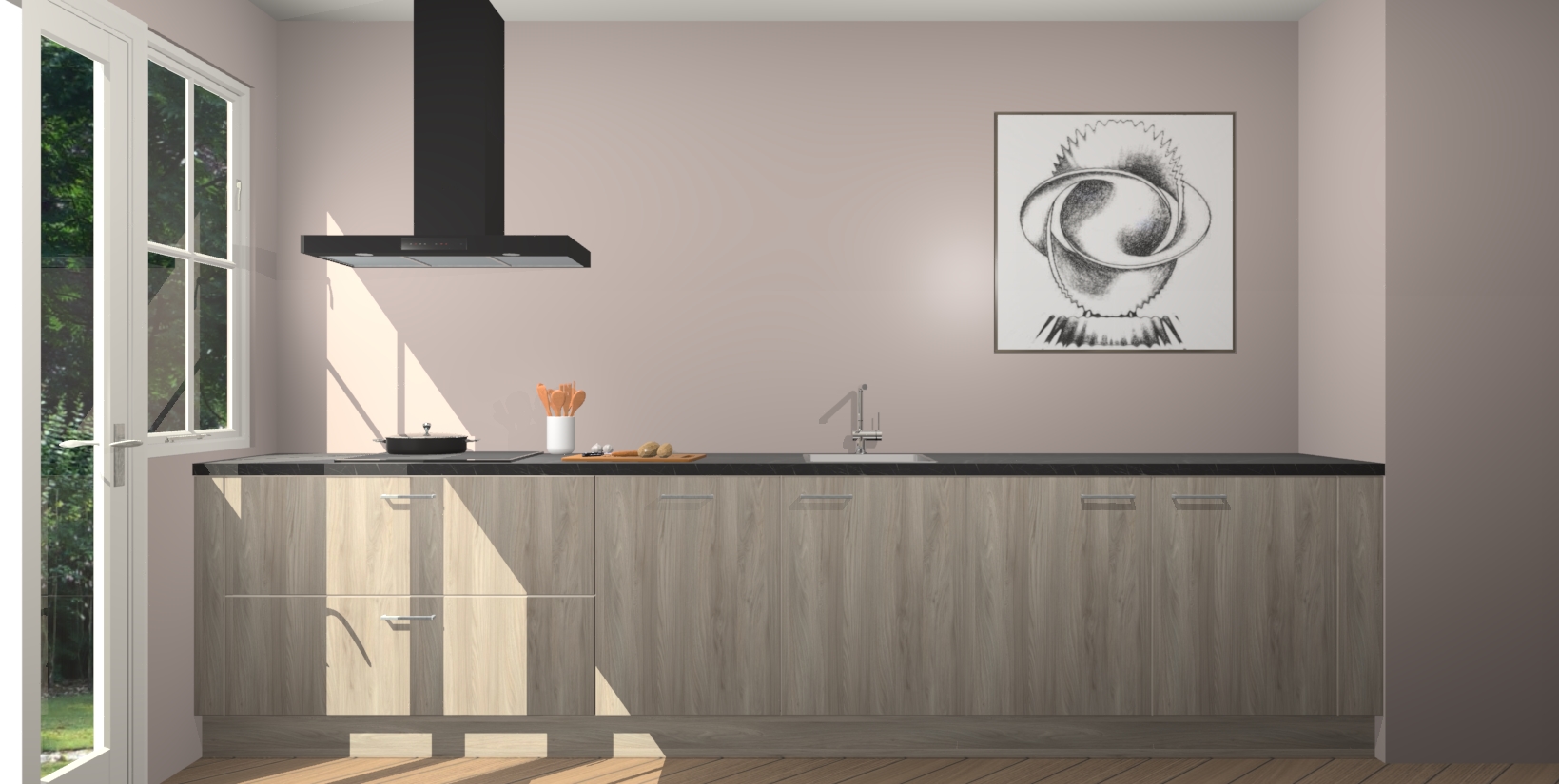 Een stijlvolle en praktische keuken als deze mag gezien worden. Dankzij de prachtige olm matte afwerking wordt de keuken gemakkelijk het middelpunt van uw huis - hij ziet er geweldig uit onder allerlei lichtomstandigheden, van dag tot nacht!