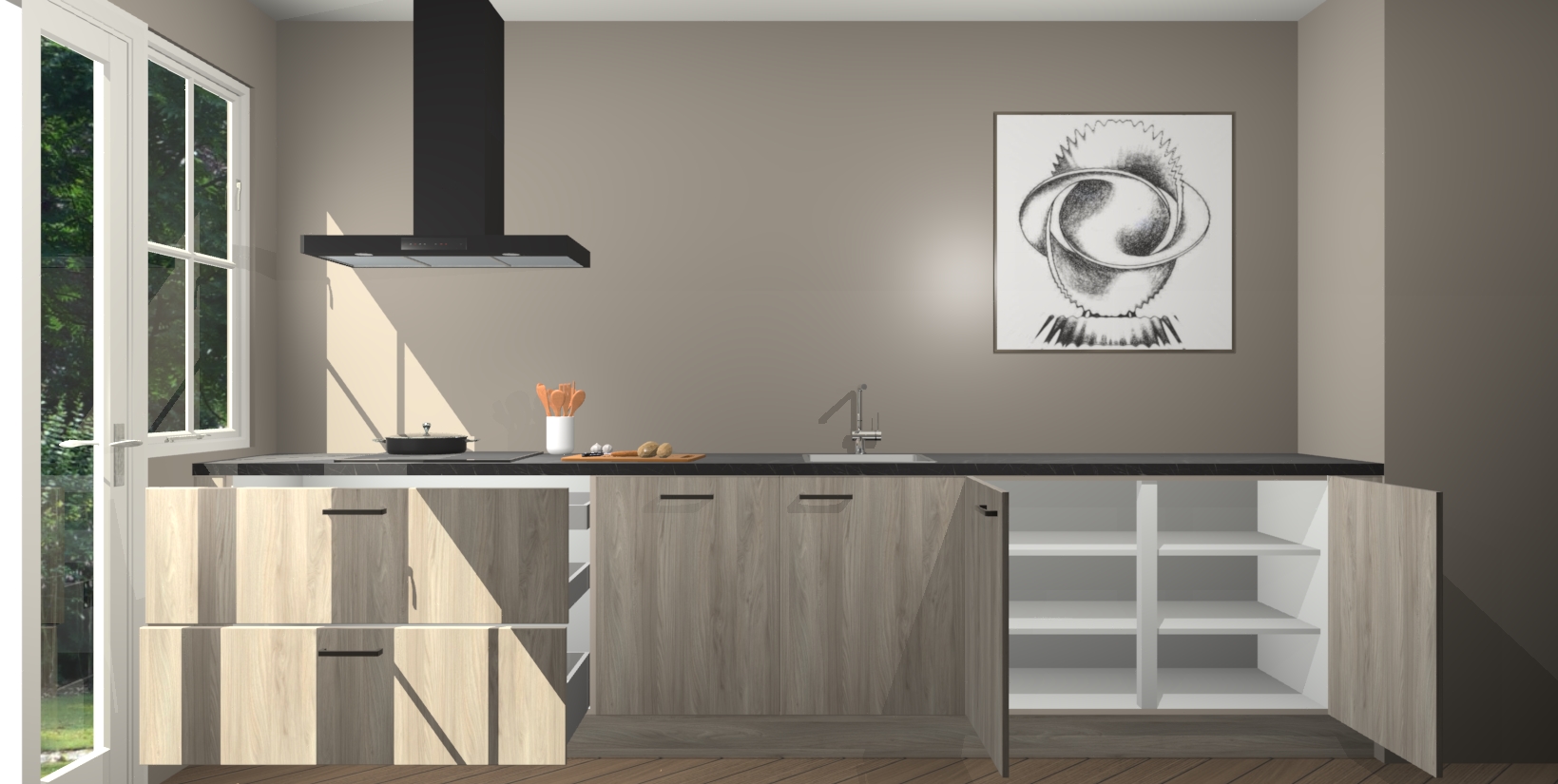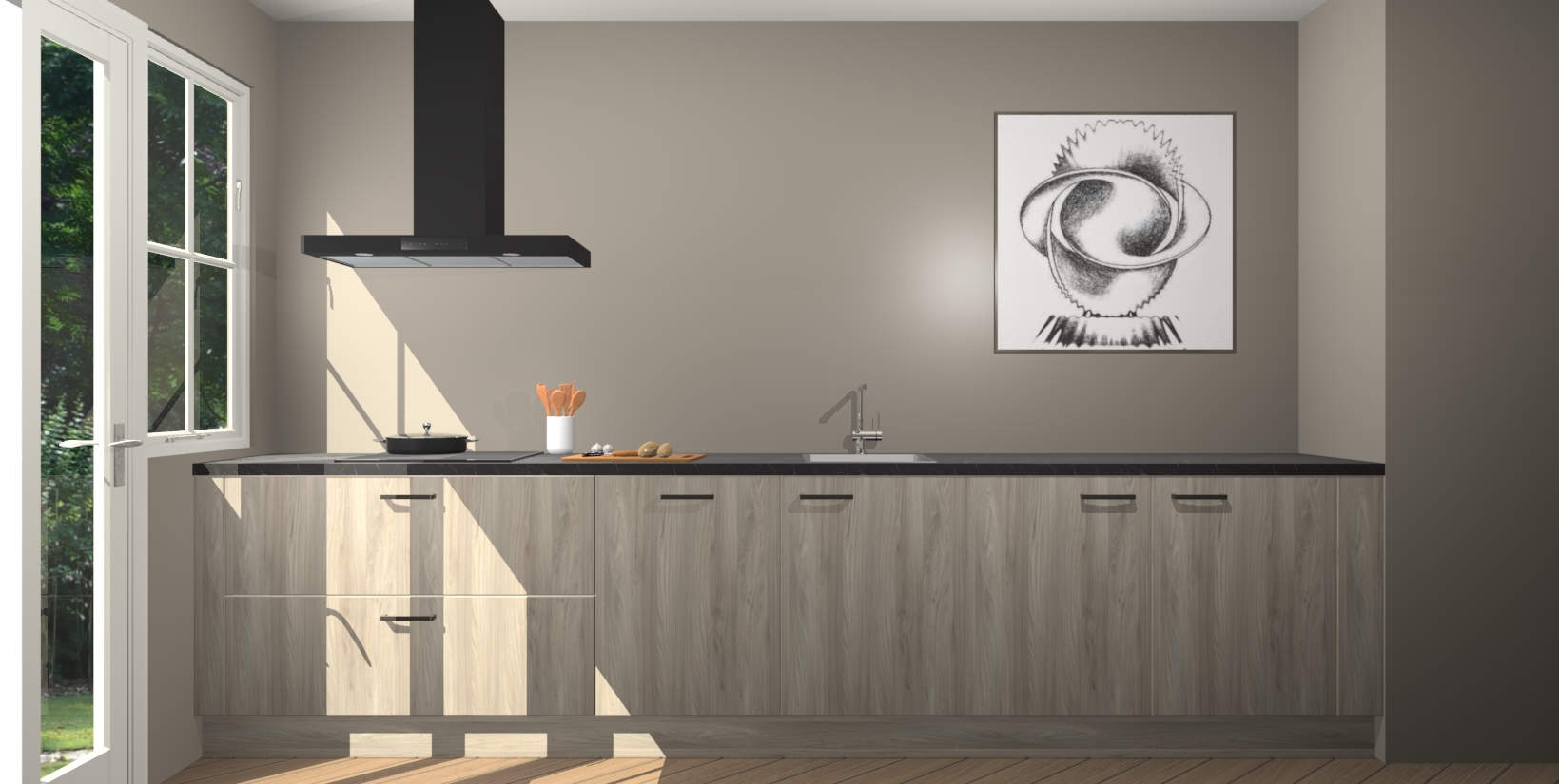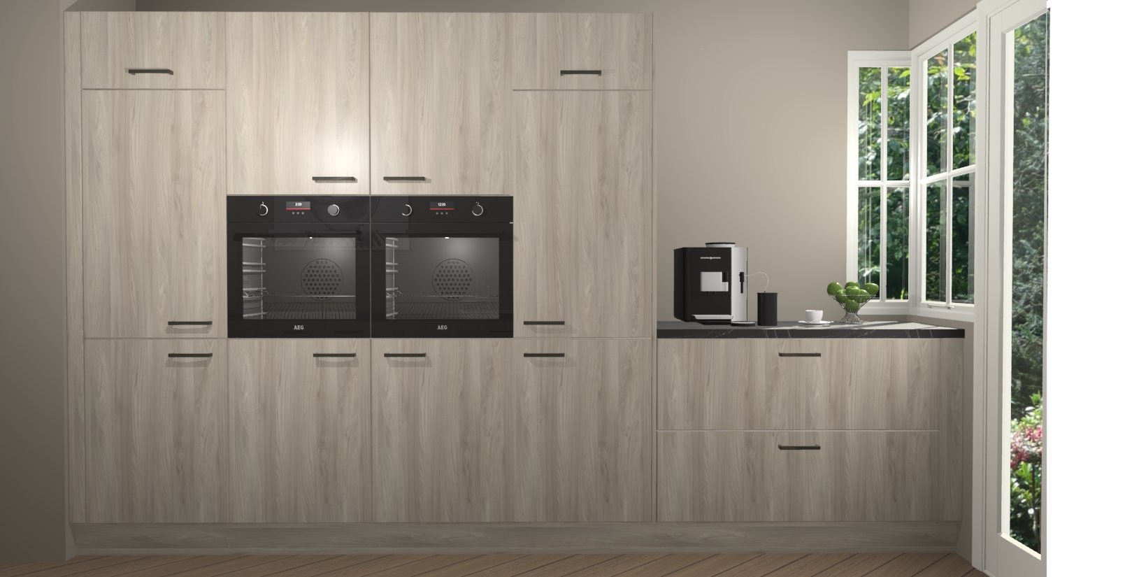 Een stijlvolle en praktische keuken als deze mag gezien worden. Dankzij de prachtige olm matte afwerking wordt de keuken gemakkelijk het middelpunt van uw huis - hij ziet er geweldig uit onder allerlei lichtomstandigheden, van dag tot nacht!