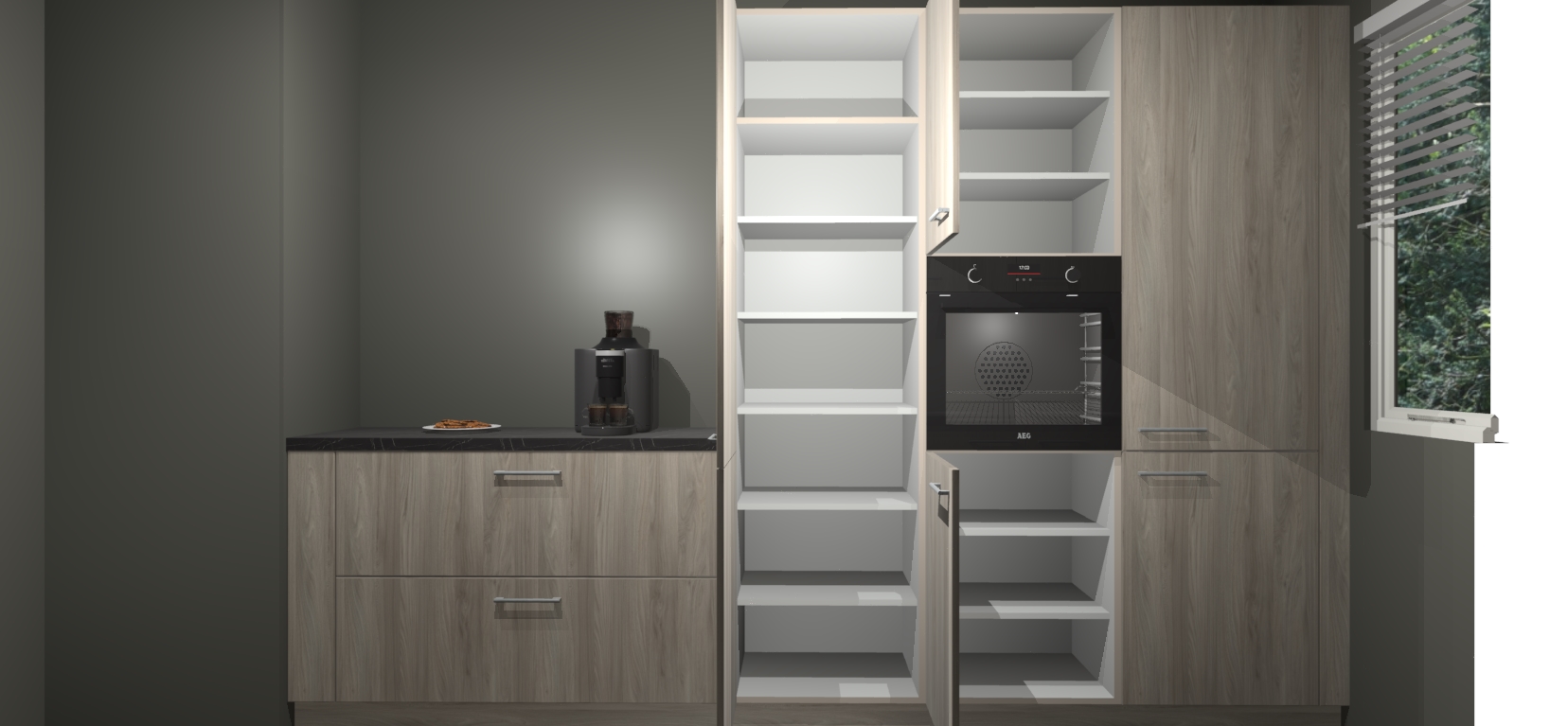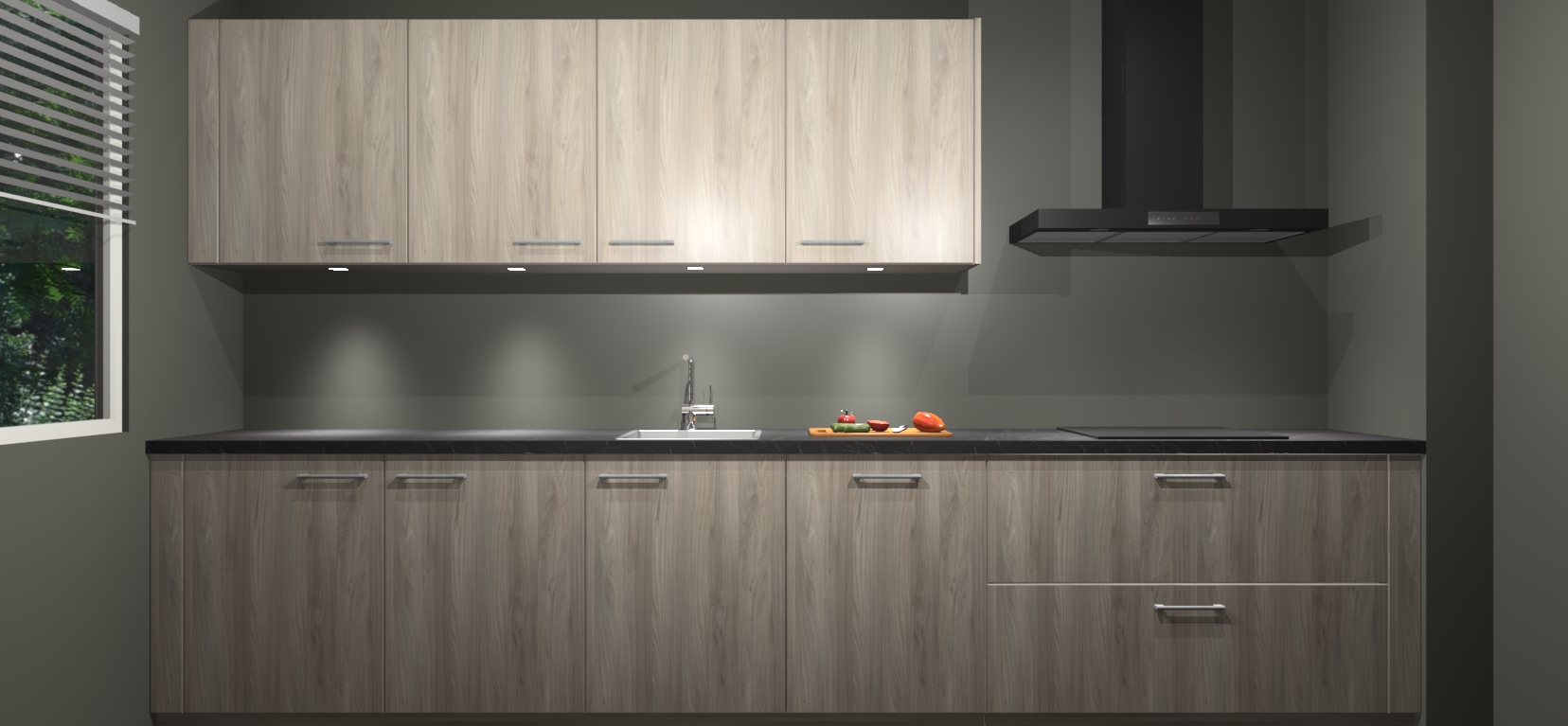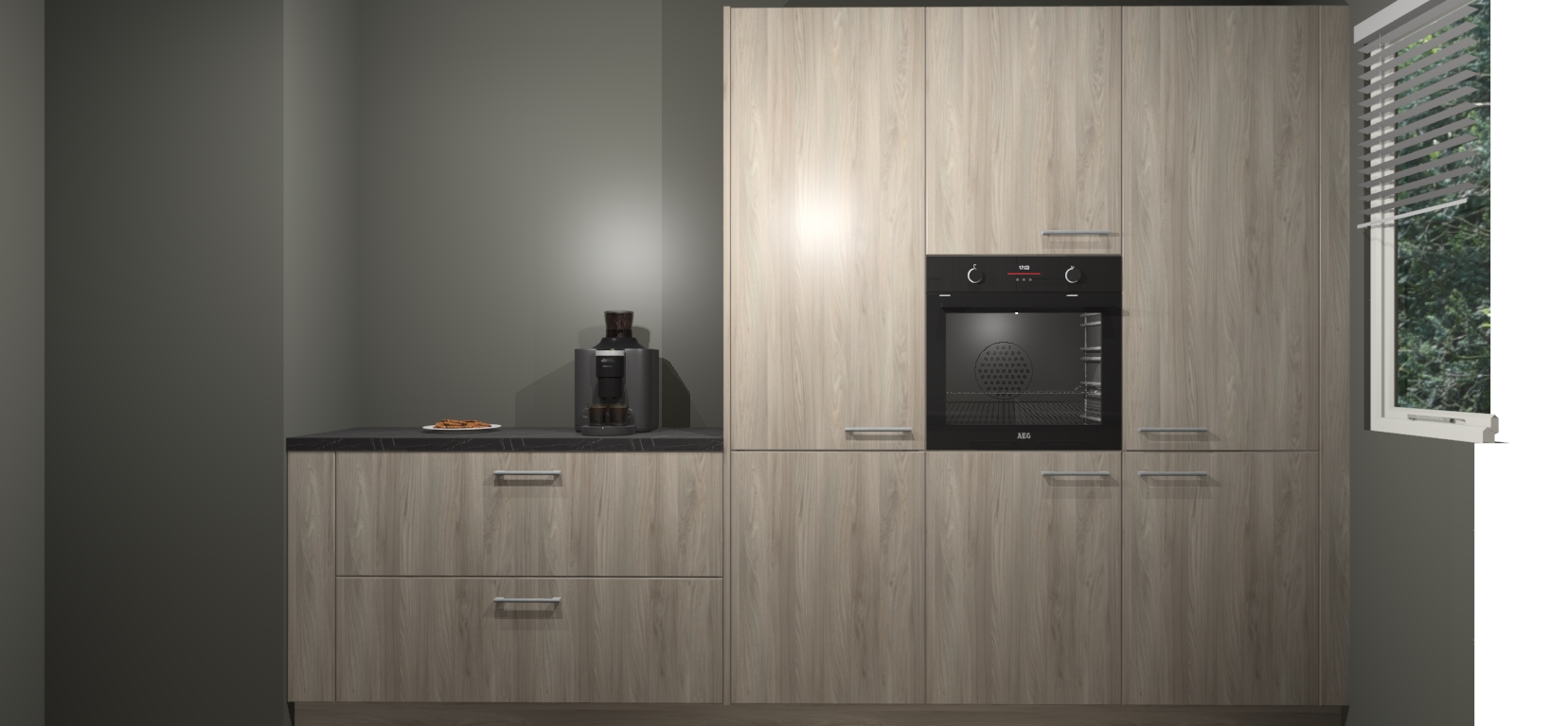 Een stijlvolle en praktische keuken als deze mag gezien worden. Dankzij de prachtige Olm matte afwerking wordt de keuken gemakkelijk het middelpunt van uw huis - hij ziet er geweldig uit onder allerlei lichtomstandigheden, van dag tot nacht!